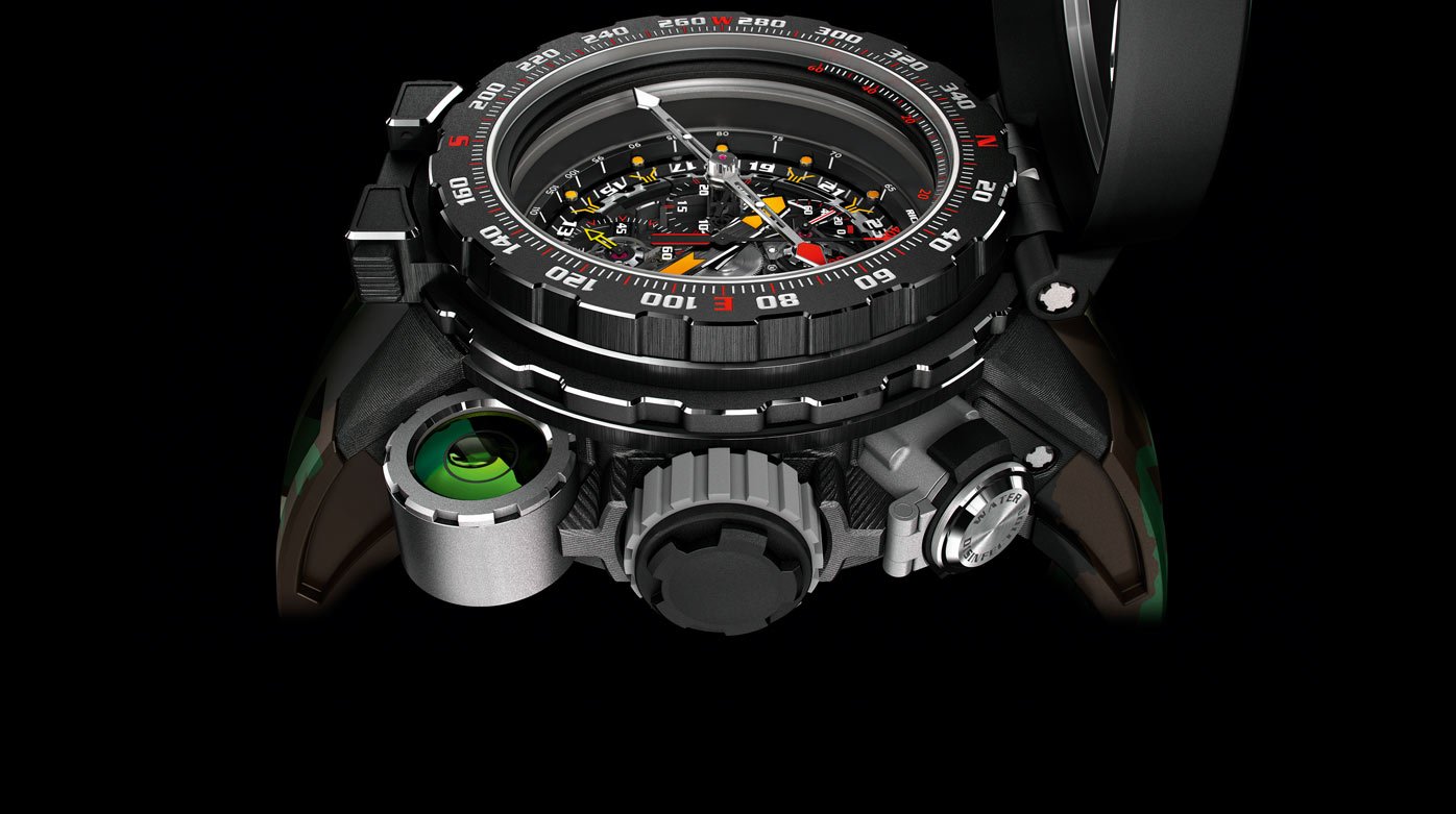 The RM 25-01 by Richard Mille is most certainly a watch that packs a punch. Its manual wind movement features a tourbillon, chronograph with 30-minute totaliser 24-hour display as well as torque, function, and power reserve indicators. It is all fitted in a 50.85mm large case made from Carbon TPT and Grade 5 titanium, which makes it surprisingly light given its size. Two Nitrile O-rings ensure a water-tight sealing of the case, protecting its precious movement up to 100 meters below the water level. Build for the true adventurer it comes even with a detachable compass, as well as a compartment that contains water purification tablets, making it the only watch in its kind to have this feature.