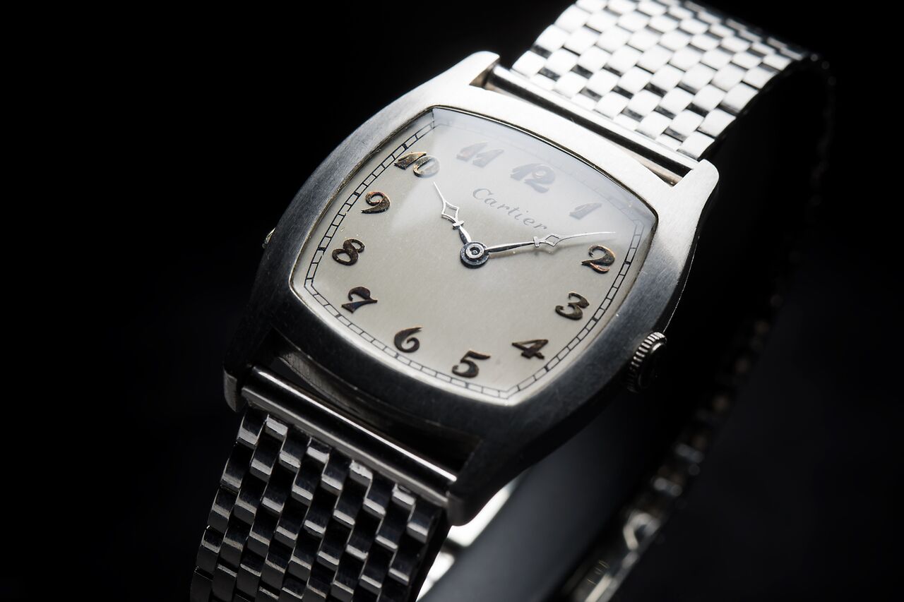 It looks exquisite in the tonneau (dare we say Tortue) case of this Cartier. While the Arabic numerals are different from what we have come to expect from Cartier, it still looks very much like a watch from La Maison. This is interesting as Audemars Piguet has also made nearly the same watch with their own signature on the dial, so we should see Cartier as a retailer, not the manufacturer. This was quite common in those days, as also other prestigious brands such as Tiffany’s, sold watches from other Swiss brands in their boutiques. The case is crafted from platinum, which was also the material of choice for the stunning bracelet.