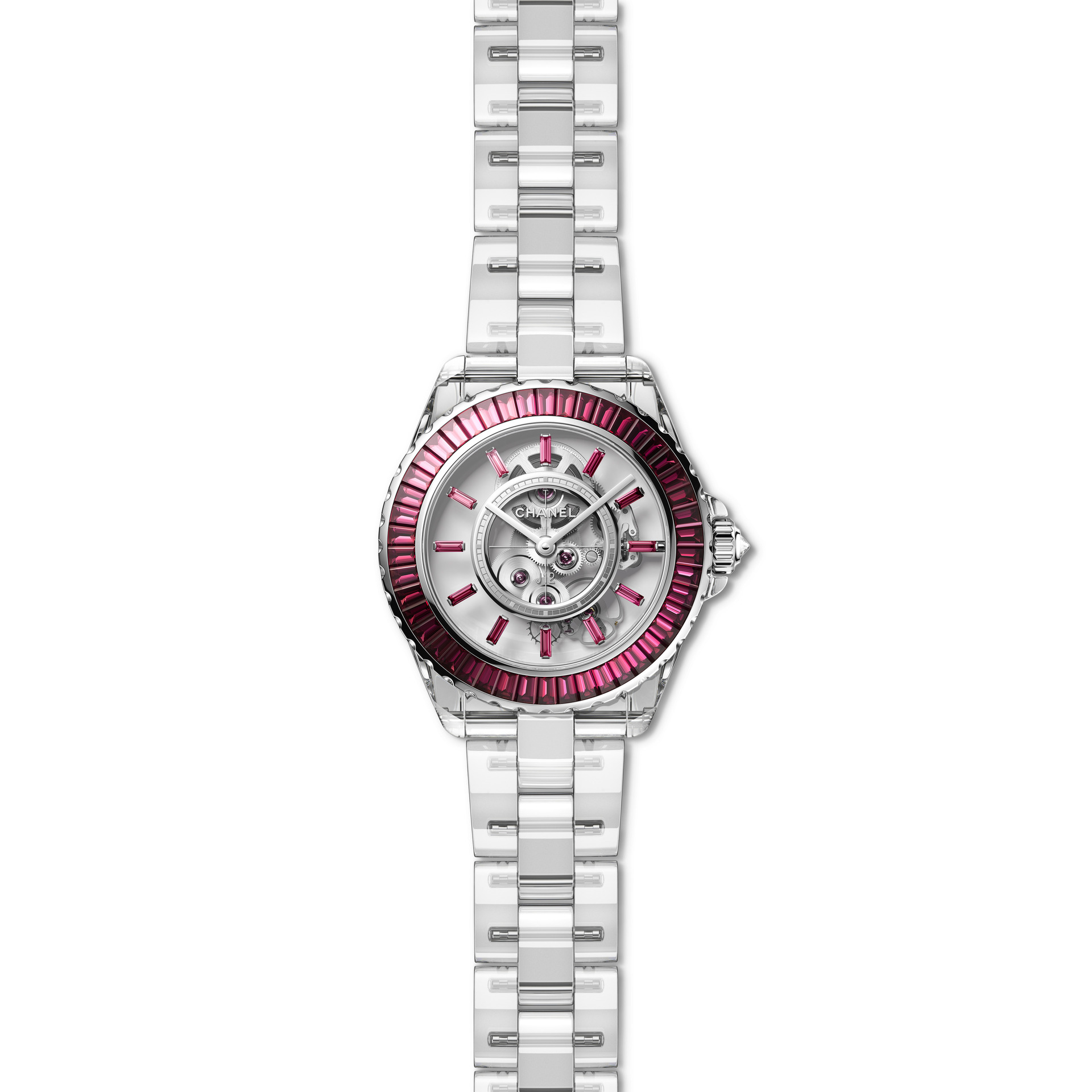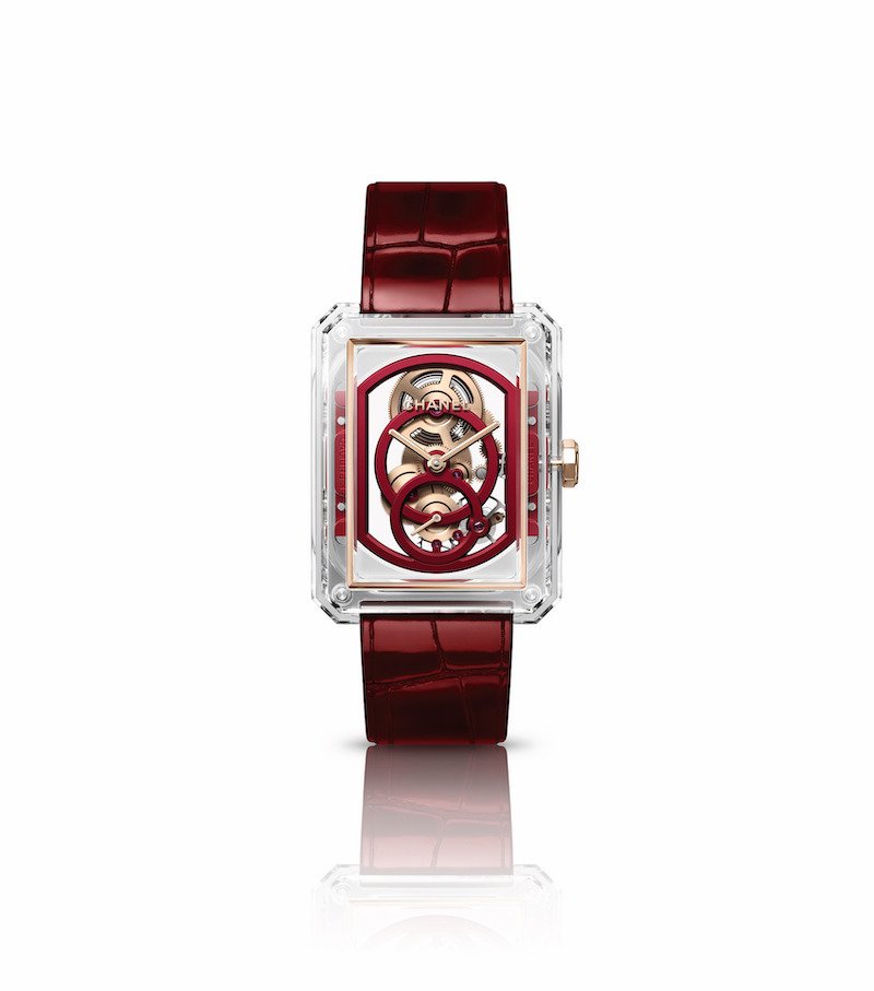The first is their famed J12, a watch initially launched in 2000. To celebrate the 20th anniversary of this model, Chanel introduced an “X-ray” version, in which the case and bracelet were made from sapphire crystal. They now take it to the next level by setting the bezel with 46 Trapeze-cut rubies. This gives the watch a generous dash of color that we see return on the dial in the 12 hours markers, which are also rubies. To create as much transparency as possible, the mainplate and bridges of the movement are also made of sapphire crystal. This makes the gear train and mainspring barrel of the manufacture movement seem to float in the air, adding another dimension to this already impressive watch, of which Chanel will make just 12 pieces.