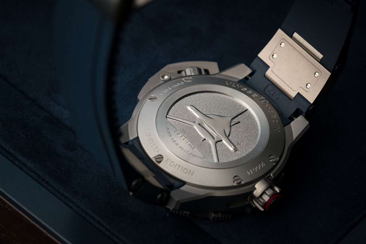 That the possibility is there, doesn’t necessarily mean that all brands do this. While the Diver Deep Dive, by Ulysse Nardin, is equipped with a manufacture movement that is worth showing off they opted for a solid caseback instead. The reasoning behind this is two-fold; first of all does this eliminate the need for one additional seal. While they are very reliable, they do increase the risk of a possible leak. As diving is all about limiting risk as much as possible, there is a strong case (no pun intended) to still use a solid caseback. This also gave Ulysse Nardin the option to engrave one of the most unusual sea creatures on it, the hammerhead shark to which this limited edition is dedicated, adding a whole other level of appeal to the watch.