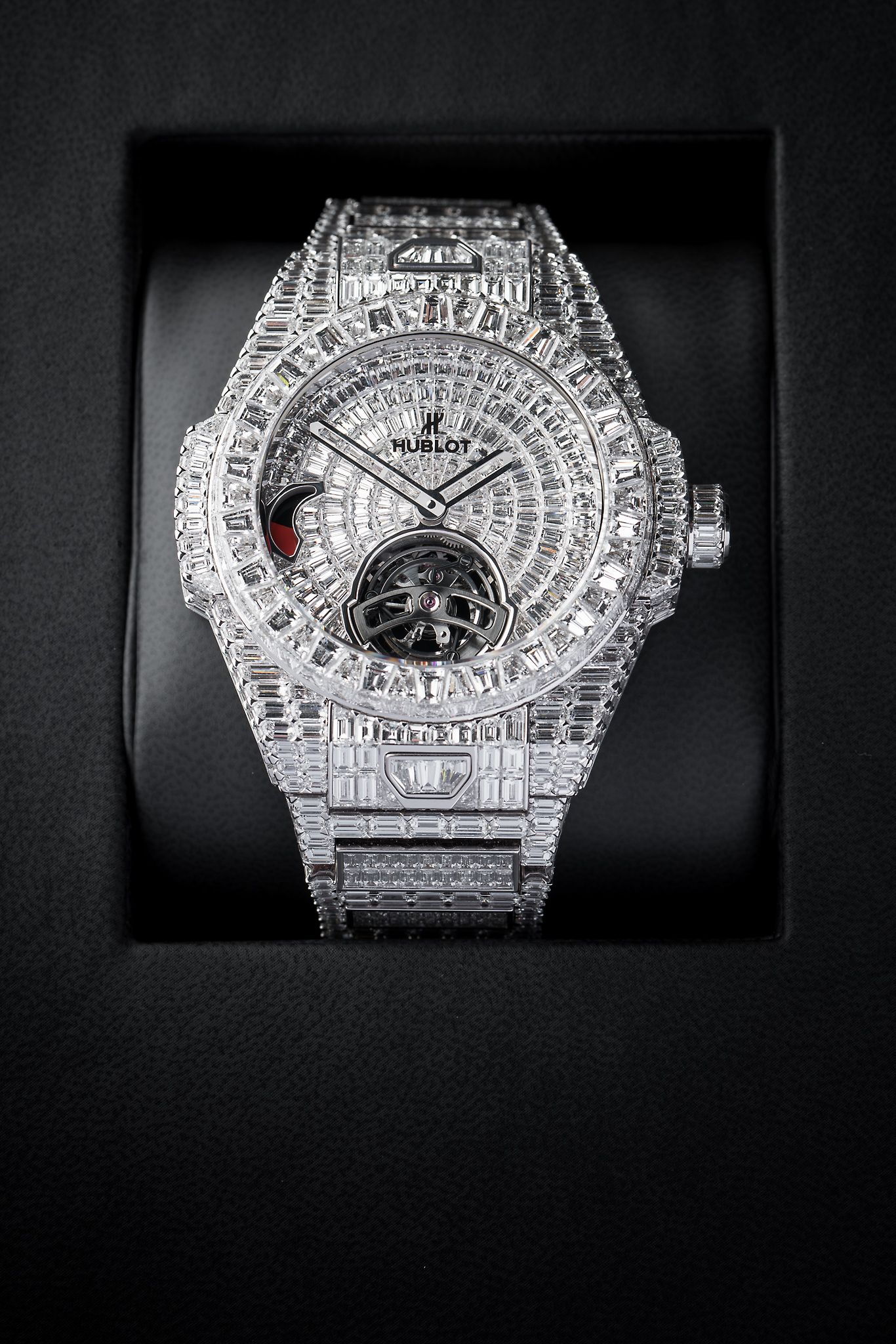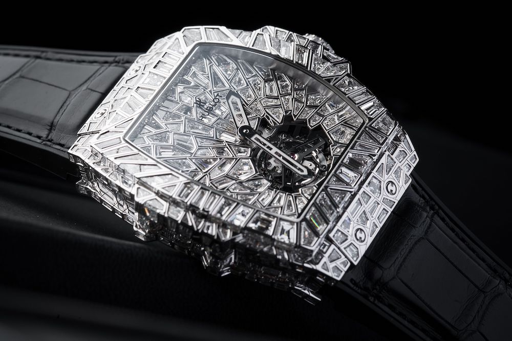 As can be expected from a brand like Hublot, does it not settle for just an ordinary setting when decorating one of their watches with diamonds. This Spirit of Big Bang is the perfect example of this. Hublot took different shapes and sizes of diamonds and set them in the case, dividing each with a white gold rim that holds the gemstone. Such a setting is extremely difficult to accomplish, especially on the already complex case shape of the Spirit of Big Bang. The result is breathtaking, as it looks like cracked ice with an ice-hole at the bottom through which we don’t see water, but a tourbillon.