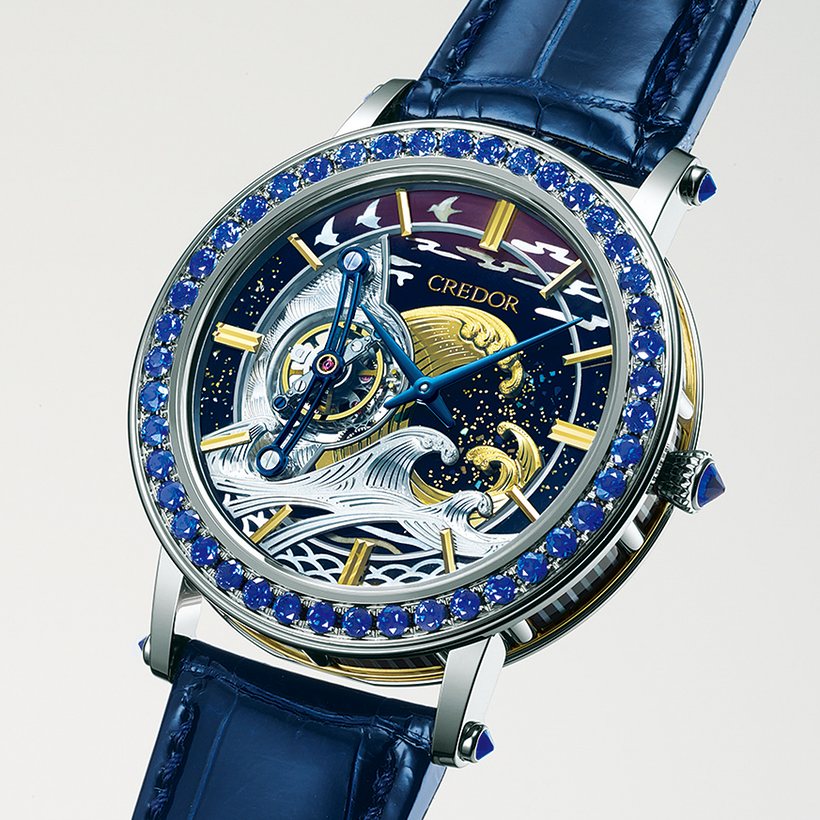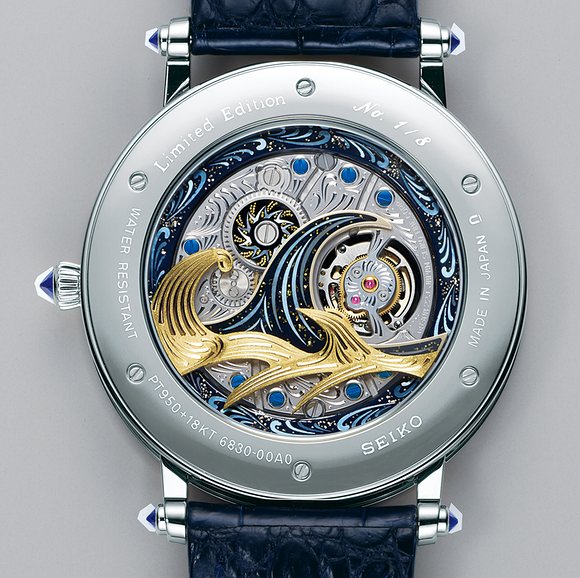 The Fugaku Tourbillon Limited Edition houses the ultra-thin tourbillon Caliber 6830, which measures 3.98,mm in thinness and is the brands first-ever tourbillon movement (based on thee Caliber 68, whose base is just 1.98mm thick). The famed “Great Wave off Kanagawa,” with a view of Mt. Fuji in the background, inspires the design of the dial. The wave is meticulously hand engraved and created in 18-karat yellow and white gold. Even the caseback shows the wave, with an outline of Mt. Fuji on the balance wheel bridge. The lacquer work on the dial is done using the ancient art of Urushi and the clouds are created in finely worked mother of pearl. The 43mm platinum watch features blue sapphires on the case sides. It is created by top Japanese artists in a limited number of 8 pieces, and each is estimated to retail for $462,000.