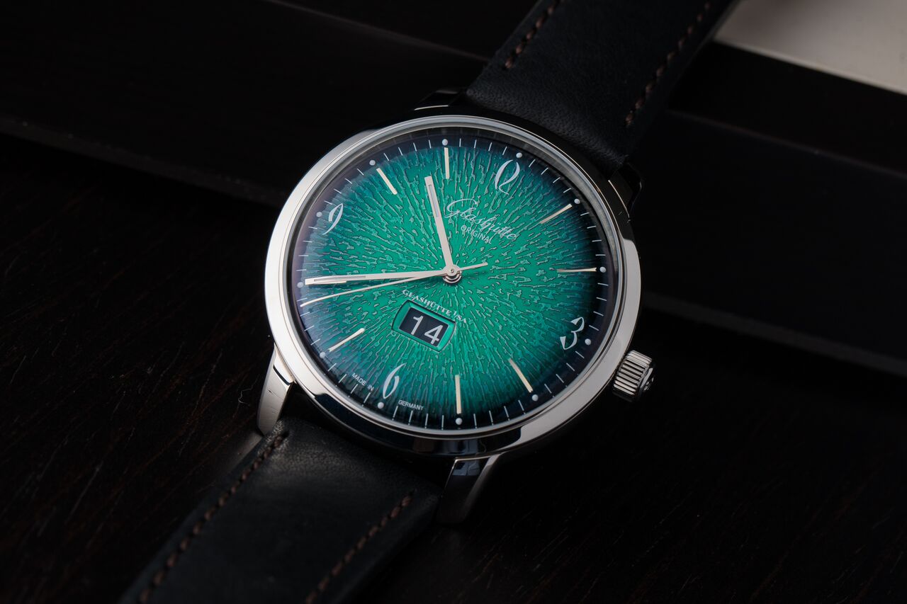 Glashütte Original introduced a very powerful statement in green with their new Sixties Panorama Date. The dial, which is made at the brands own dial manufacture, has a stunning motif that creates an effect which gives the green an extra dimension. Glashütte Original combines this skillfully with white numerals and minute track while the date features a black background and also the strap is of this color. The result is very well balanced, yet at the same time also incredibly powerful!