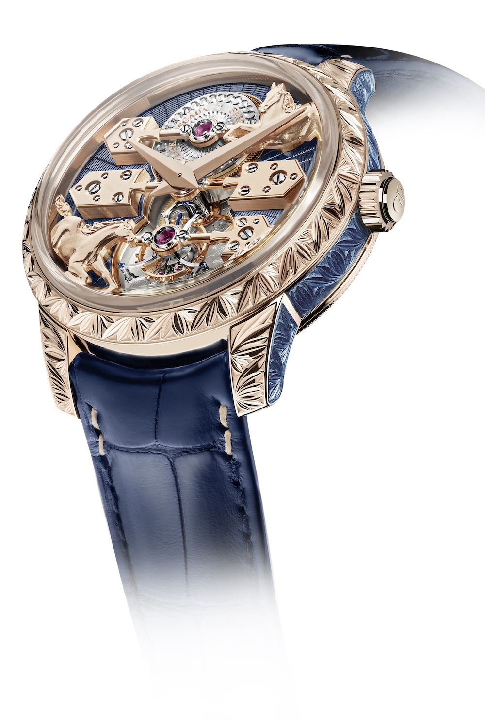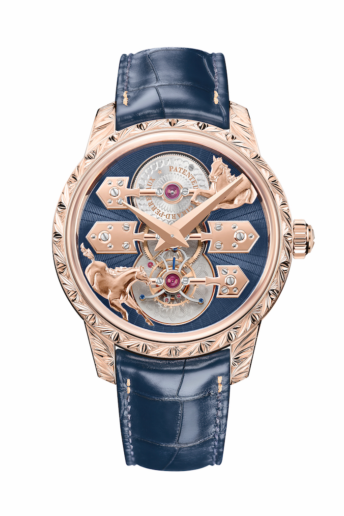 One of the key elements of the original timepiece was horses, and Girard-Perregaux gives them center stage. Two of the three gold bridges are reworked, showing these noble animals in fine detail. Behind them is a refined decor of hand-made guilloche, covered with blue enamel, although Girard Perregaux will also make it in six other colors. It gives a beautiful contrast with the pink gold of the bridges and the case. The back is equally impressive. Girard Perregaux opted to have the sapphire crystal covered as a nod to the watch’s predecessor. Here three horses form a dynamic scene. The quality of the engravings, combined with the enamel and guilloche, is of a very high level. As there is a lot of relief, light can play with the different surfaces in which the muscles of these magnificent animals beautifully come to life.