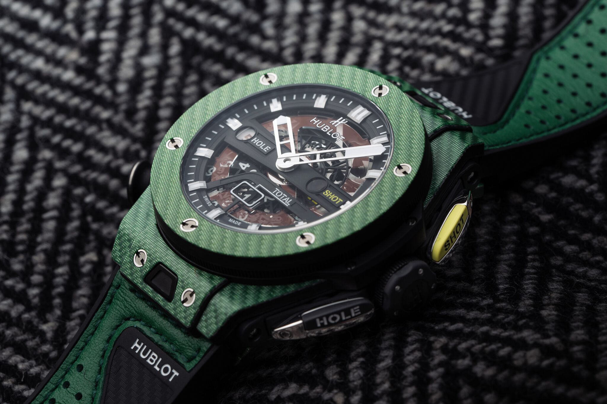 The Big Bang Unico Golf is another great success for Hublot. The watch can sincerely be considered a hole in one by the brand. Previously it was released in white and blue, but recently did Hublot also launch a green version in a limited edition of 100 pieces. The case is made from carbon fiber with a green Texalium upper layer. This material has an extraordinary texture, which gives the watch a unique appearance. Especially in combination with the strap, whose design is inspired by that of a golf glove. The mechanical movement not only tells the time but also allows you to easily keep track of your score as you play a round of golf.