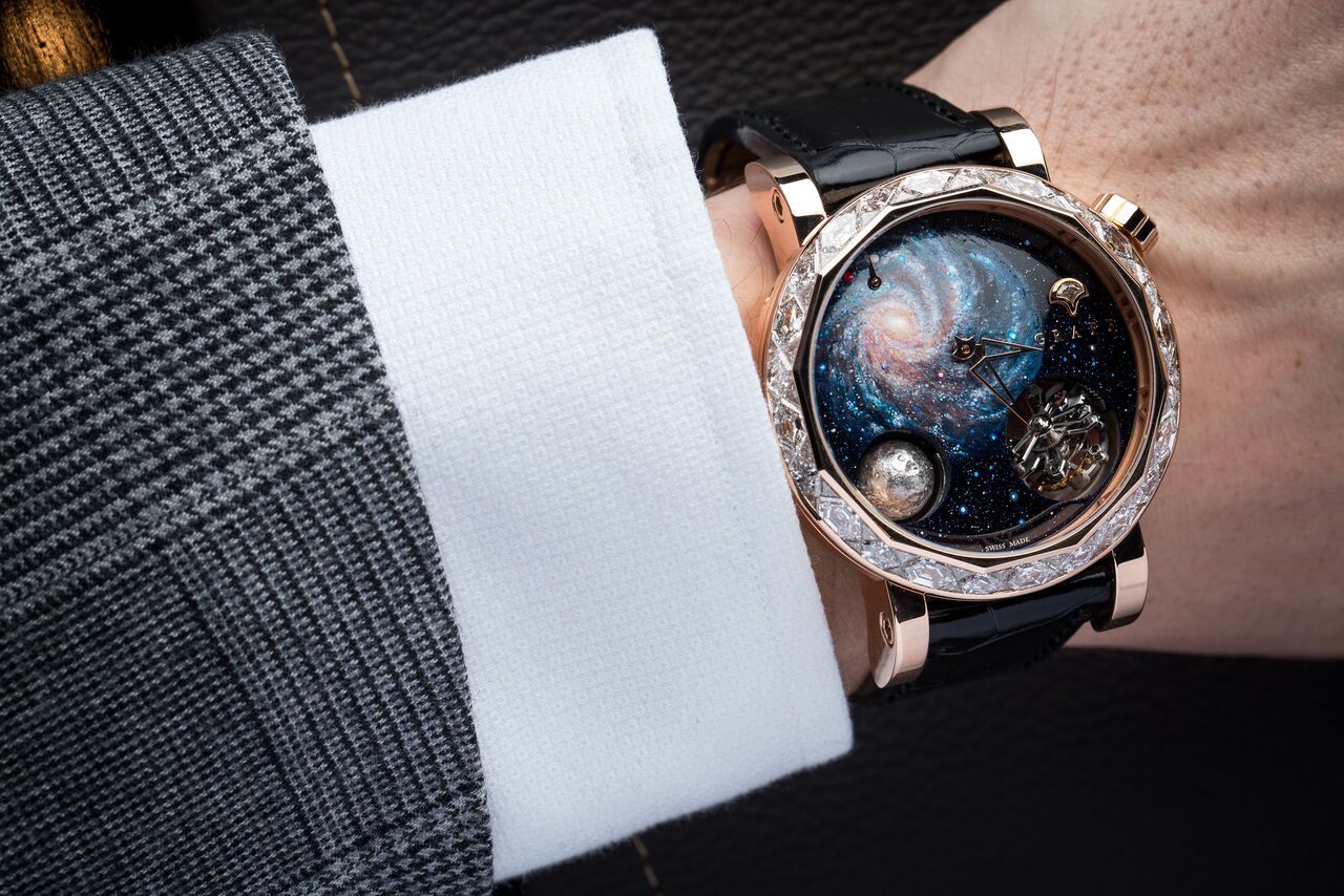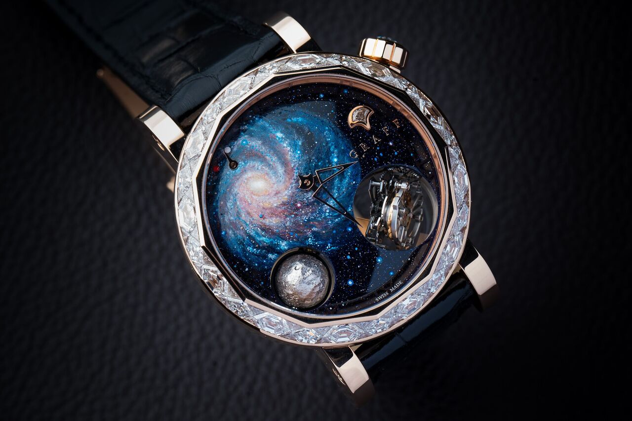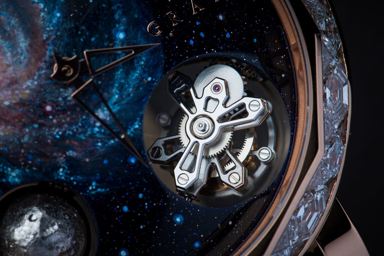 Three other features will fight for your attention. First, there is the feature that will try to seduce you by its motion: the double axis tourbillon. It shares the lower part of the dial with an oversized moon phase indicator, which is a 3D sculpture of this heavenly body itself. Half of it is veiled in black, the other half in a shimmering silver, showing you its current state. But the GyroGraff World also gives you an insight deeper into space. The dial features an incredibly detailed painting of an entire galaxy in the vibrant colors of Grand Feu enamel. The result is so captivating you almost forget that this watch indeed tells the time, let alone that it also features a power reserve indicator.