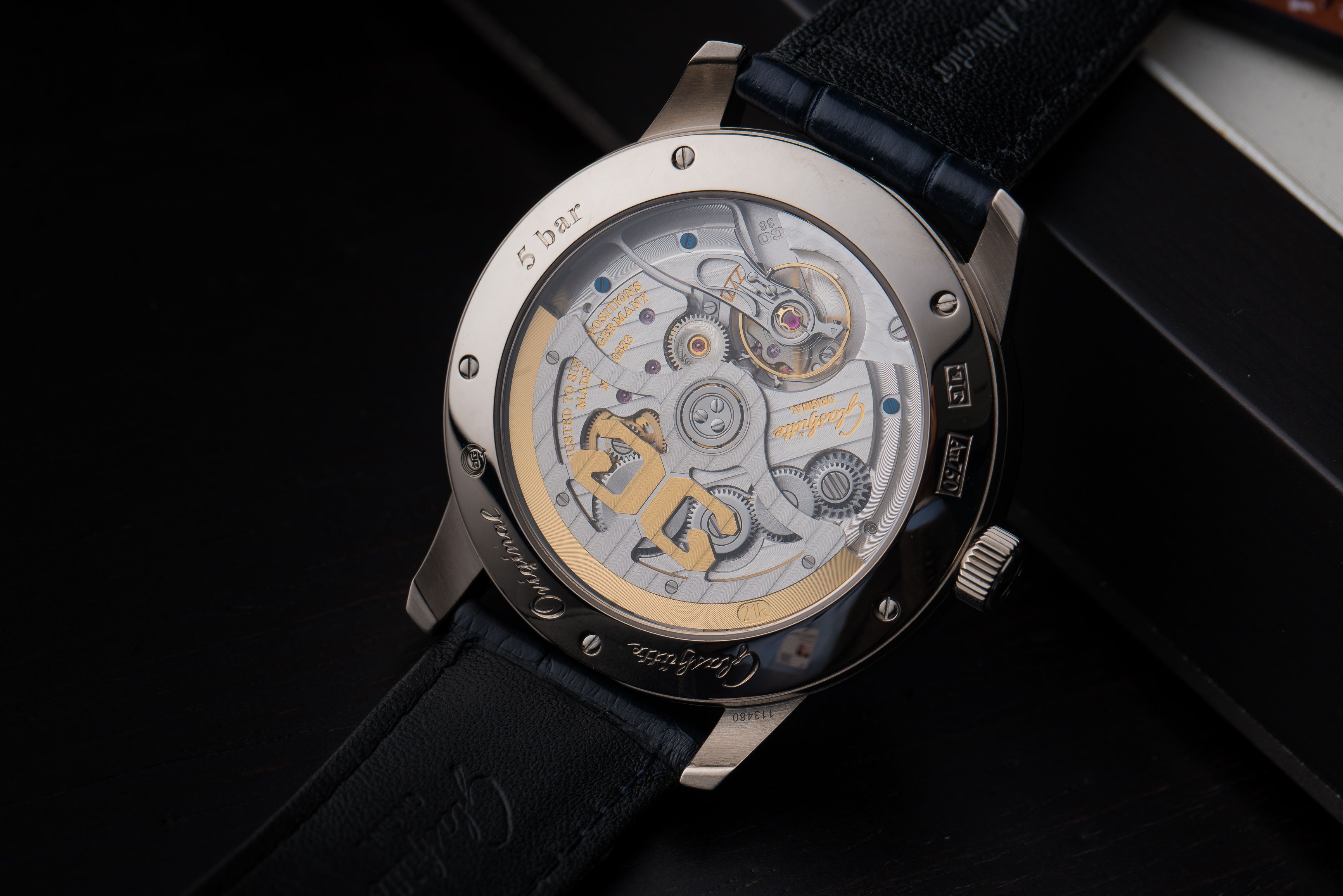 Another advantage of this watch is that all the functions are very easy to read, and that is something we cannot say about all perpetual calendars. One feature that most certainly contributes to this is the panorama date, a Glashütte Original hallmark. The watch is powered by caliber 36-02, a movement that the brand makes in its manufacture in the heart of Glashütte. It is crafted in the region’s typical style, with a three-quarter plate and a Glashütte stripe finish. For optimum winding efficiency is the oscillating weight, with Glashütte Original logo in it, fitted with a 21 karat gold segment. When fully wound, the Senator Excellence Perpetual Calendar has a power reserve of 100 hours, quite a welcome feature when this perpetual calendar is not the only watch in your collectsion.