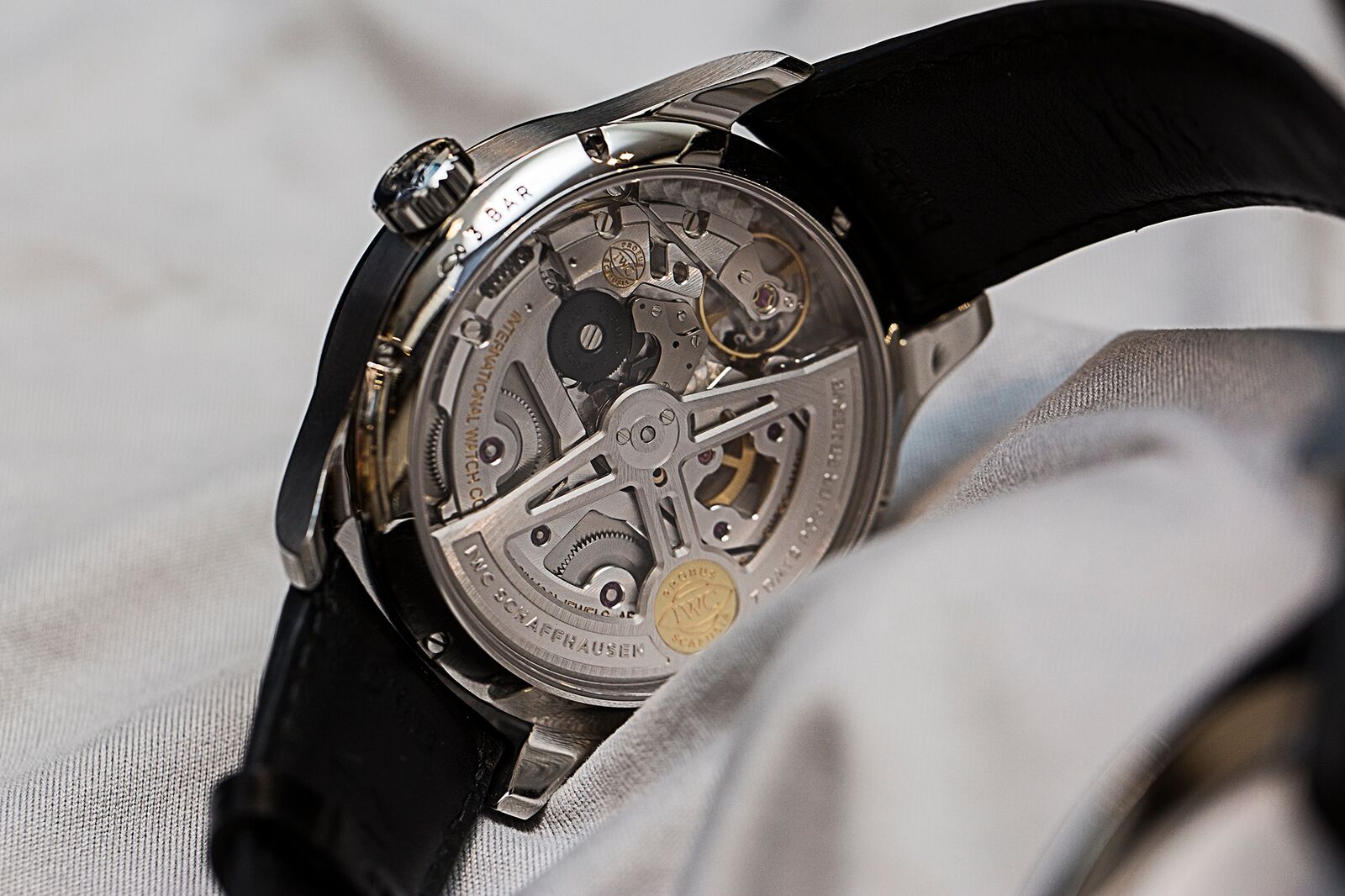 Powered by IWC Manufacture caliber 52850, the Portugieser Annual Calendar retains all the functions we know from the Portugieser Automatic. It is fitted with a Pellaton automatic winding system and has a very generous power reserve of seven days. The date moved to the twelve o’clock location and is now flanked by the month and day indication. Being an annual calendar, it will always display the correct date and month, except for February, when the date needs to be manually reset. Another aspect that I personally truly appreciate in the Portugieser, and the annual calendar is no exception to this, is that when you turn the watch over, you see a small rim around a large, oversized movement. It is quite gratifying to see that the watch you are wearing is nearly all movement, the perfect combination of brawn and brains in a single package.