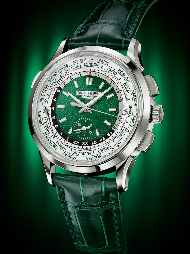 In 2016, Patek Philippe delighted the world with the reference 5930G-010, a watch that combined a world time function with a flyback chronograph. Featuring a blue dial and white gold case, it became an instant favorite of the brand’s connoisseurs with a passion for its more complex creations. Last week Patek Philippe introduced a new version that raises the bar to an even higher level, combining a platinum case with a green dial and details.