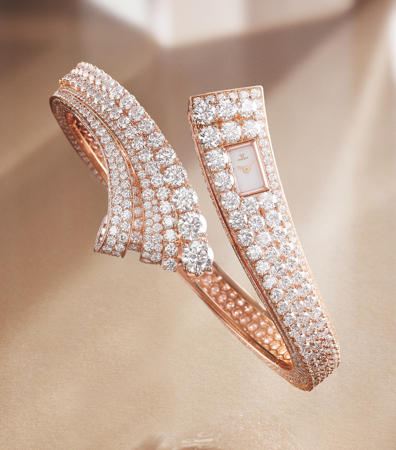 In 1929, Jaeger-LeCoultre created one of the smallest mechanical movements, measuring 14 mm in length, 4.8 mm in width, and just 3.4 mm thick. Weighing only a gram is this movement one of the most significant achievements in watchmaking history. Jaeger-LeCoultre used it this year in a unique creation that combined it with beautiful brilliant-cut diamonds in a bangle-style watch. With its asymmetrical design is this timepiece a real eye-catcher, in which the dial is perfectly integrated. The pink gold gives a warm contrast with the diamonds and makes this a truly timeless creation.