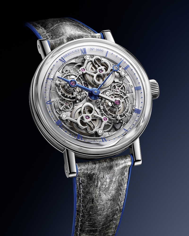 The Classique Double Tourbillon is arguably one of Breguet‘s most imposing watches, yet in 2020 they found a way to outdo themselves. They emphasize its complex nature by skeletonizing the watch even further, allowing a full view of the twin escapements. The watch’s back is equally imposing with a hand-engraving of the original Breguet workshop at the ‘Quai de l’Horloge,’ a street in Paris near the Notre Dame. The cherry on top is the strap, which features a top layer of extremely thin cut natural slate, giving the watch an even more unique appearance.