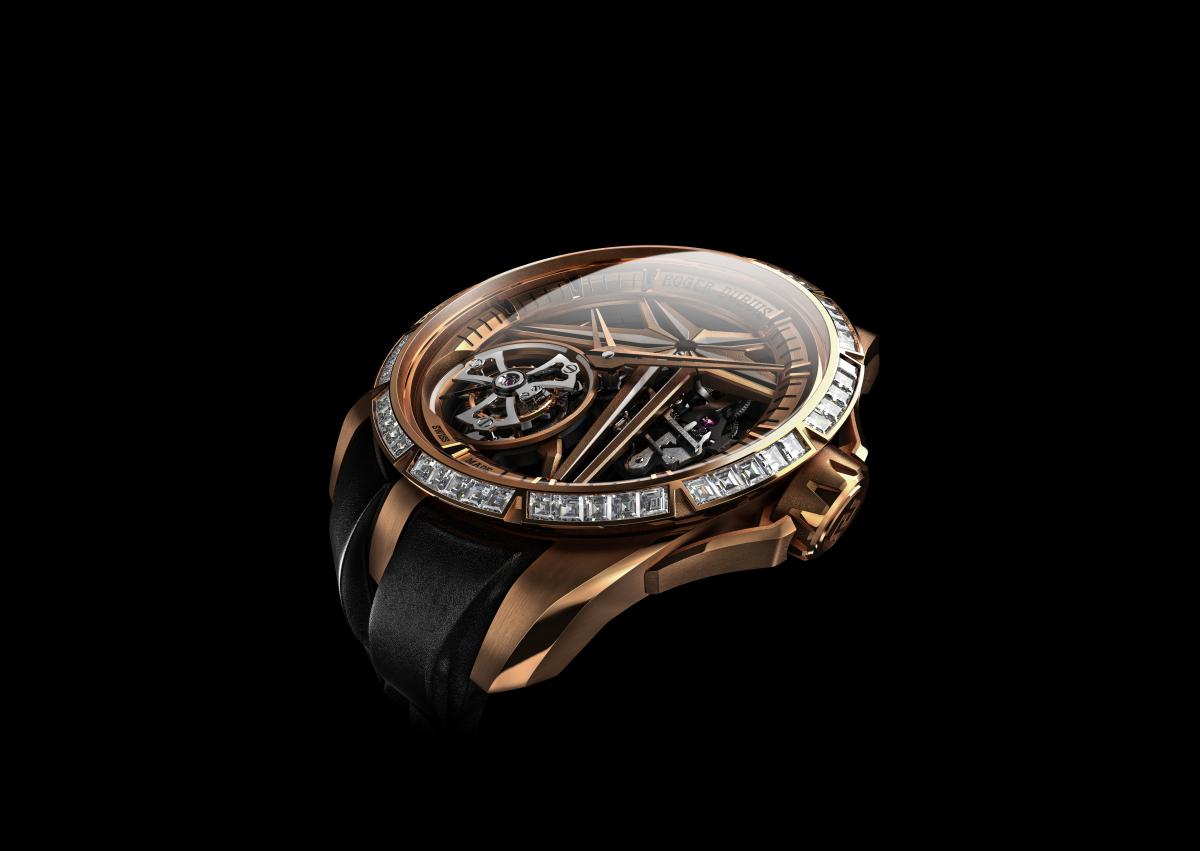 Roger Dubuis offers the Excalibur Single Flying Tourbillon in four varieties. The most understated is the one with a titanium case featuring a dark DLC coating. Its sibling introduces a dash of color as it combines a case made of white gold with a blue CVD-coated flange and movement bridges. This is complemented by a calf leather strap in matching color. With EON Gold is Roger Dubuis bringing a unique pink gold alloy that has a significantly reduced tendency to tarnish. The brand gives this metal center stage in the Excalibur Single Flying Tourbillon by giving the flange and movement bridges a grey coating. All these three watches are limited to 88 pieces each. More rare is the boutique exclusive version made from EON Gold with a bezel set with baguette-cut diamonds. Of this one, just 8 pieces will be crafted. Unique is also that not only the hands and hour markers are applied with luminous material, but that it can be found on the bridges and even underneath the diamonds as well. As it is in different colors, this gives quite a spectacular light show for the Excalibur Single Flying Tourbillon, proving beyond any doubt that in some cases, being single is the best.