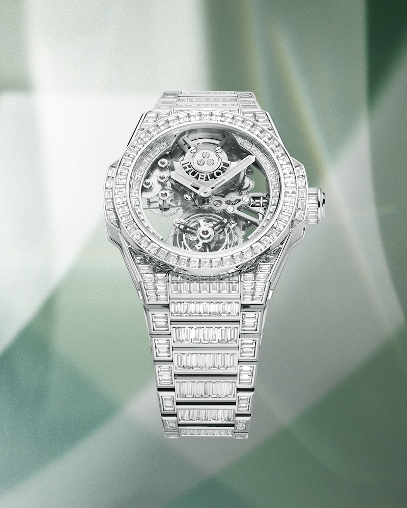 Mechanically, the watch is the same as the other Big Bang Integral Tourbillons, with the exception of the row of baguette-cut diamonds surrounding the movement. They form a visual connection between the in-house developed and made caliber HUB6035 and the precious case and bracelet. The movement is a gem on its own, with a white gold micro-rotor at twelve o’clock perfectly balancing the tourbillon at six. Thanks to the use of bridges made from transparent sapphire crystal, all the intricate parts of the movement become visible. It makes the Hublot Big Bang Integral Tourbillon High Jewellery an imposing watch that goes beyond its precious nature and price tag. Instead, it highlights different areas of expertise in perfect synergy, and that is another hallmark of Hublot in everything they do.
