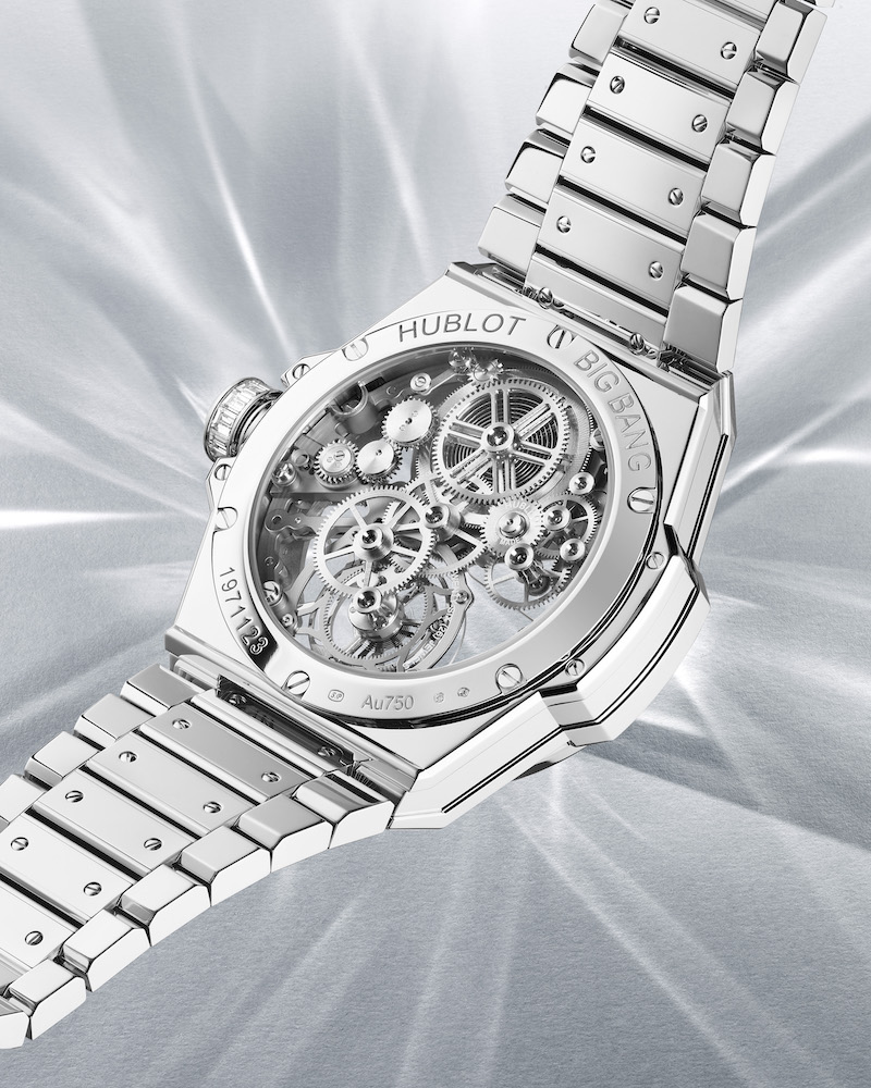 One of the things that Hublot always looks for in its diamond-set pieces is to create synergy with the watch’s design. This is a significant challenge with the Big Bang Integral Tourbillon, a watch known for its skeletonized, transparent movement and case with an integrated bracelet. Hublot’s answer to this is setting it with baguette-cut diamonds only and utilizing an invisible setting. A total of 484 diamonds were used, weighing 30,9 carats, leaving no surface untouched. Because of the cut shape of diamonds and the invisible setting, it almost seems as if this Hublot is chiseled out of this precious material.