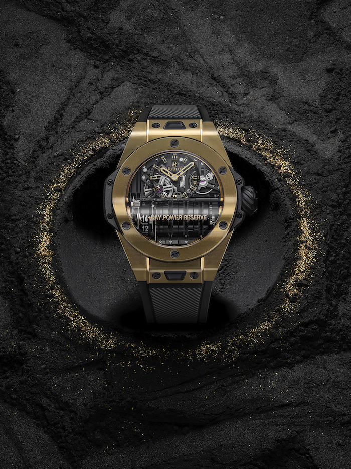 Magic gold is another unique material that Hublot developed and truly embodies the ‘Art of Fusion.’ By combining ceramic with 18 karat gold through a complex and patented process, you get the best of both worlds. While maintaining the precious metal’s visual appeal, the fusion with ceramic makes it very resistant to scratches. Hublot now introduces the Big Bang MP-11 in this material. This charismatic watch stands, in particular, out for its seven mainspring barrels, which are placed in-line and give the Big Bang MP-11 a power reserve of 14-days.