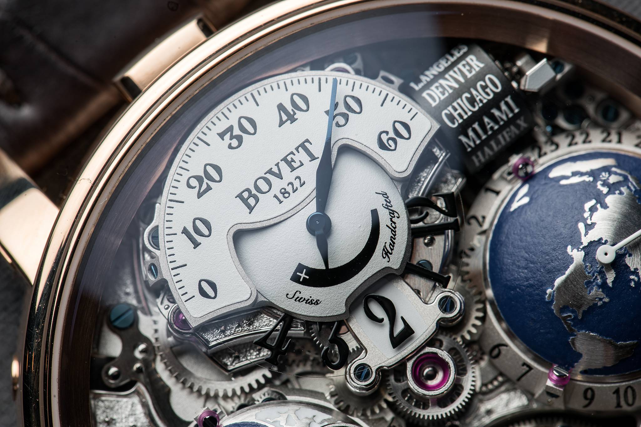 A first hemisphere was chosen to signify the Earth and allow for the reading of universal time, which is displayed in 3-D at 3 o’clock. A hand fastened to the North Pole follows its curve. This can be assigned to any one of the 24 time zones upon selection. At its tip, a concentric ring displays the time in the chosen time zone, while the name of the city corresponding to that time zone appears on one of the two concentric rollers indexed to the hemisphere.