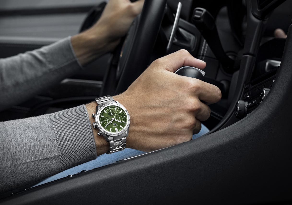 Launched in 1963, has the Carrera always been an essential model for TAG Heuer. So when they introduce a new generation, you know that it will be good. The four new models all share a clean design, where form and function go hand in hand. They feature a 44mm case with inside automatic caliber Heuer 02, with its impressive 80-hour power reserve. Improved ergonomics have also been top of mind during the development. While three of the new models have a ceramic bezel, it is the one with stainless-steel bezel that stands out particularly. Donned with a dial in a vibrant color green that resemblance fresh grass, is it a stunning eyecatcher. The color looks perfect on the watch, and as the Carrera is known as the racing chronograph, it almost makes you want to go out and look for a sports car in this color to compliment it.
