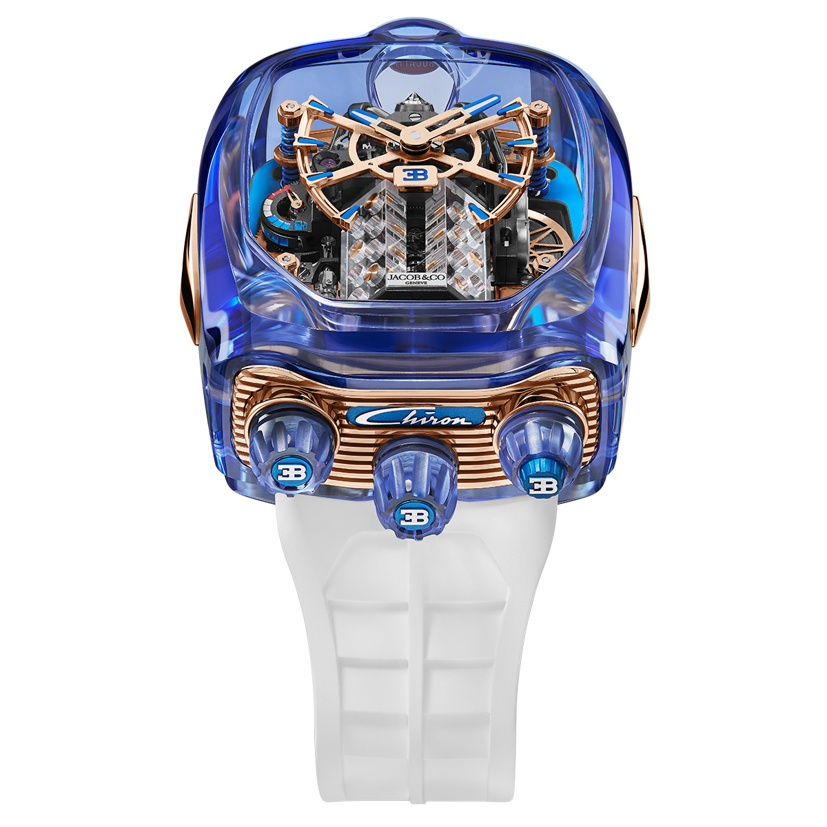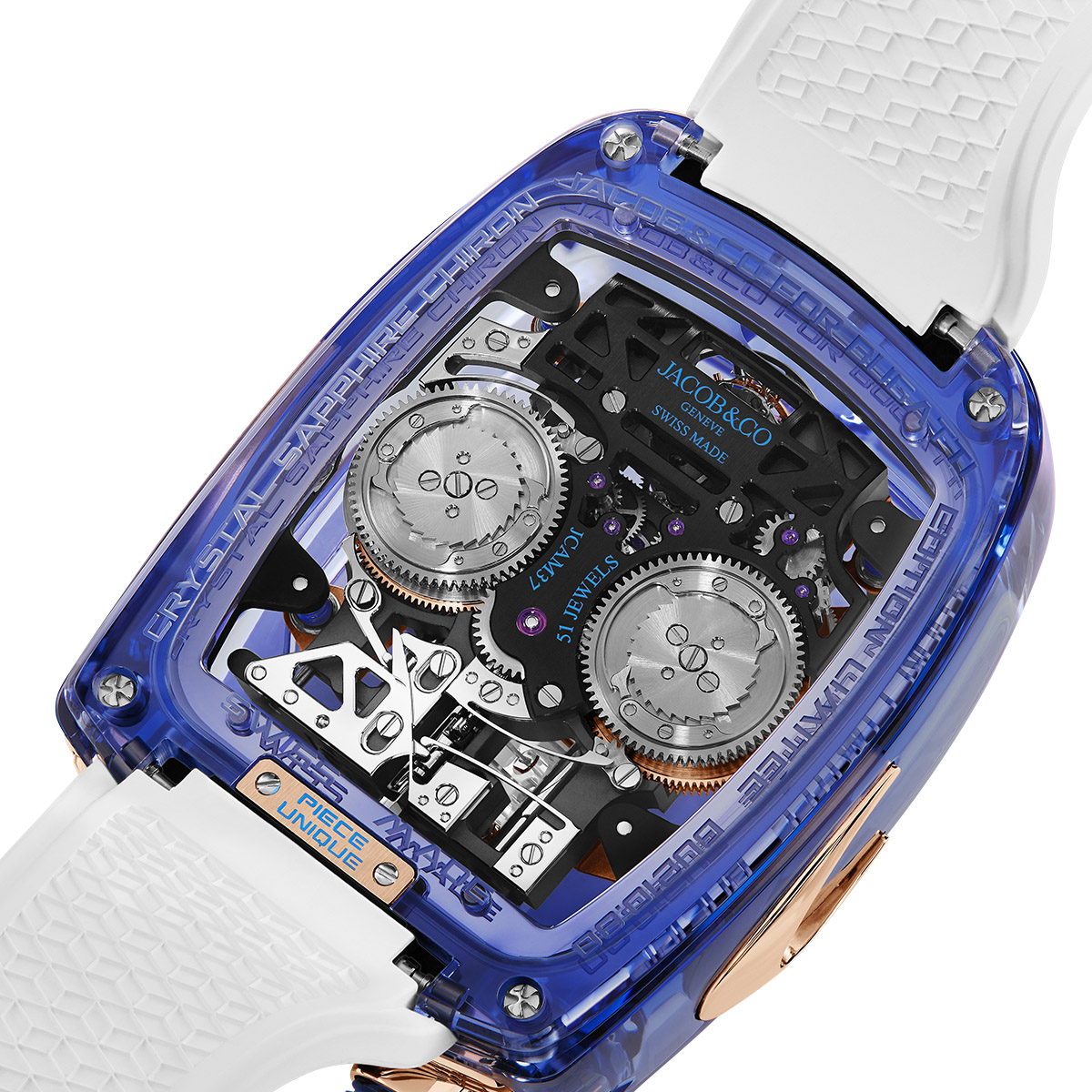 Designed in a stunning, rich blue shade, the fully transparent sapphire crystal case is inspired by the flowing lines of the Chiron and reveals every aspect of the 578 hand-decorated and hand-assembled components of the JCAM37 manual wound caliber, including the fully functional replica of the Bugatti W16 engine. The case’s design is a true testament to Jacob & Co.’s expertise and high watchmaking as the brand continues to push the boundaries in craftsmanship.