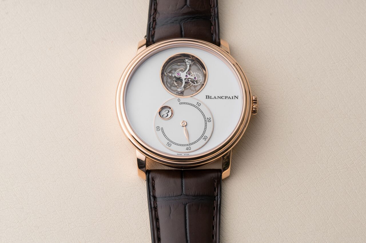 Blancpain surprised us this year at Baselworld with the Villeret Tourbillon Volant Heure Sautante Minute Retrograde. Just as A. Lange & Söhne was Blancpain not satisfied with just having a jump hour, but also added a flying tourbillon and a retrograde minute hand to it. The result is a breathtaking, highly complex watch with a very clean and pure look. This emphasises the delicate design of the Villeret case and the Grand Feu enamel dial.