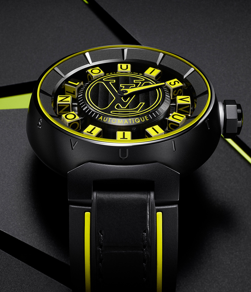 Inspired by the bioluminescence of deep-sea creatures, the Tambour Spin Time Air Quantum utilizes a dozen tiny LEDs that light up the Spin Time display from within, creating an electrifying glow. The hour cubes illuminate on demand, adding a fourth dimension to the signature complication. The 42mm watch features a sleek matte black titanium case complemented by a contrasting luminous yellow-green color on the dial — the trademark colors of Super-Luminova. The Tambour Spin Time Air Quantum embraces a bold, vibrant design that is both sophisticated and contemporary, adhering to the codes of Louis Vuitton watchmaking.