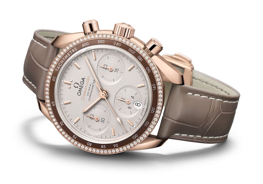 Watches don’t get any more professional than the Omega Speedmaster, the first watch worn on the moon. Gold might not be an obvious choice to craft such a watch from, but the result is surprisingly elegant when you do. This is most certainly the case with the two new models that Omega recently introduced. With a diameter of 38mm are they slightly smaller than their ‘professional’ sibling, but still have plenty of wrist presence. They also combine elegance with practical use, as is evident from, for example, the bezel. It is split into two parts, one made from aluminum with a tachymeter scale on it, and the other set with 90 brilliant-cut diamonds.