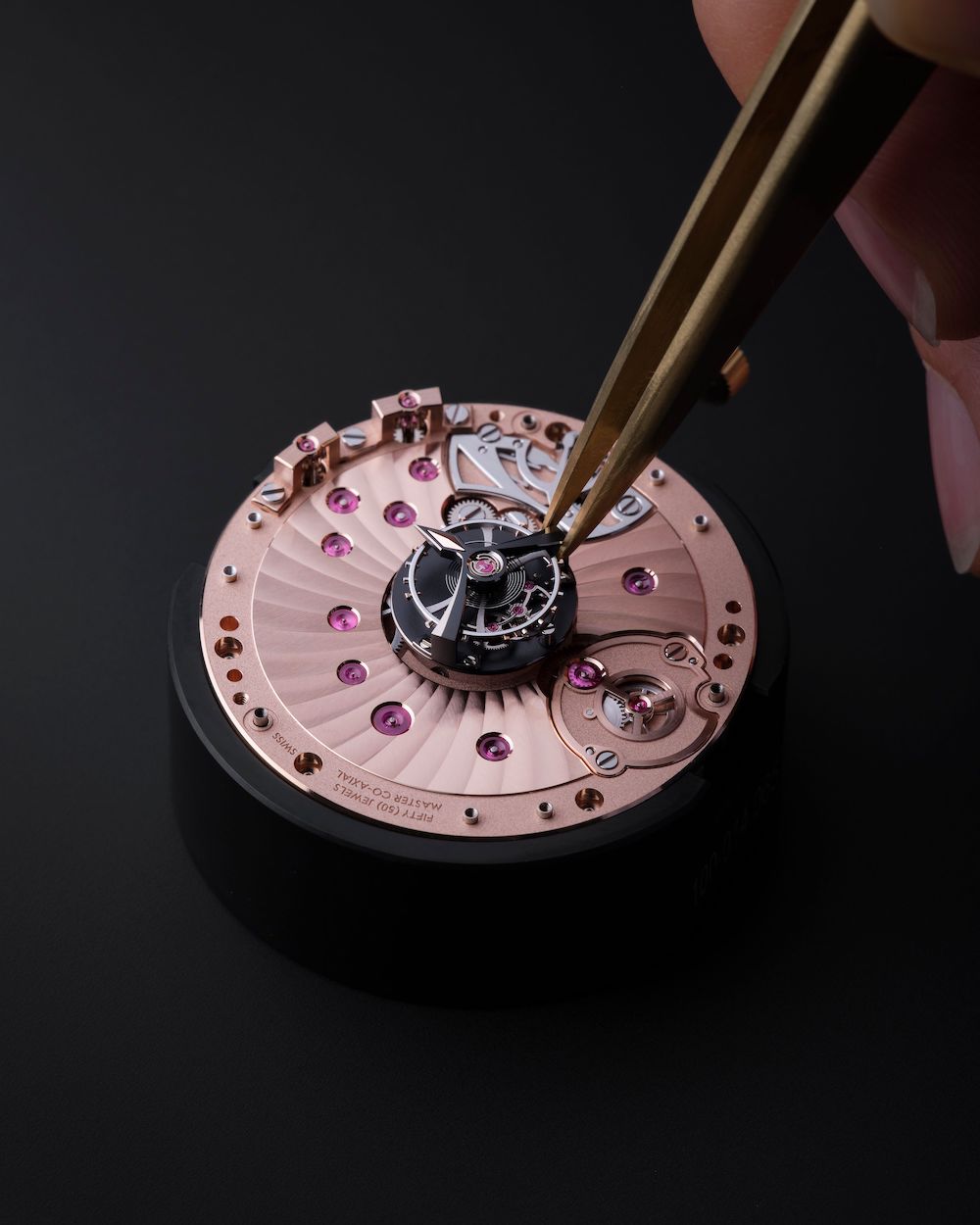 Many things make this new Omega so exceptional. First of all, is the manual wind movement, where the bridges and main plate are made out of 18K Sedna gold, certified as a Master Chronometer by METAS, an independent institute. While it is already challenging for a regular movement to meet the requirements to get this certification, it is even more difficult for a tourbillon. The tests also require it to be exposed to magnetic fields of 15,000 gauss, after which it still needs to remain precise. One of the ways Omega tackles this challenge is by making the tourbillon cage out of black ceramised titanium. The watch also features a co-axial escapement, which can be seen just behind the tourbillon cage.
