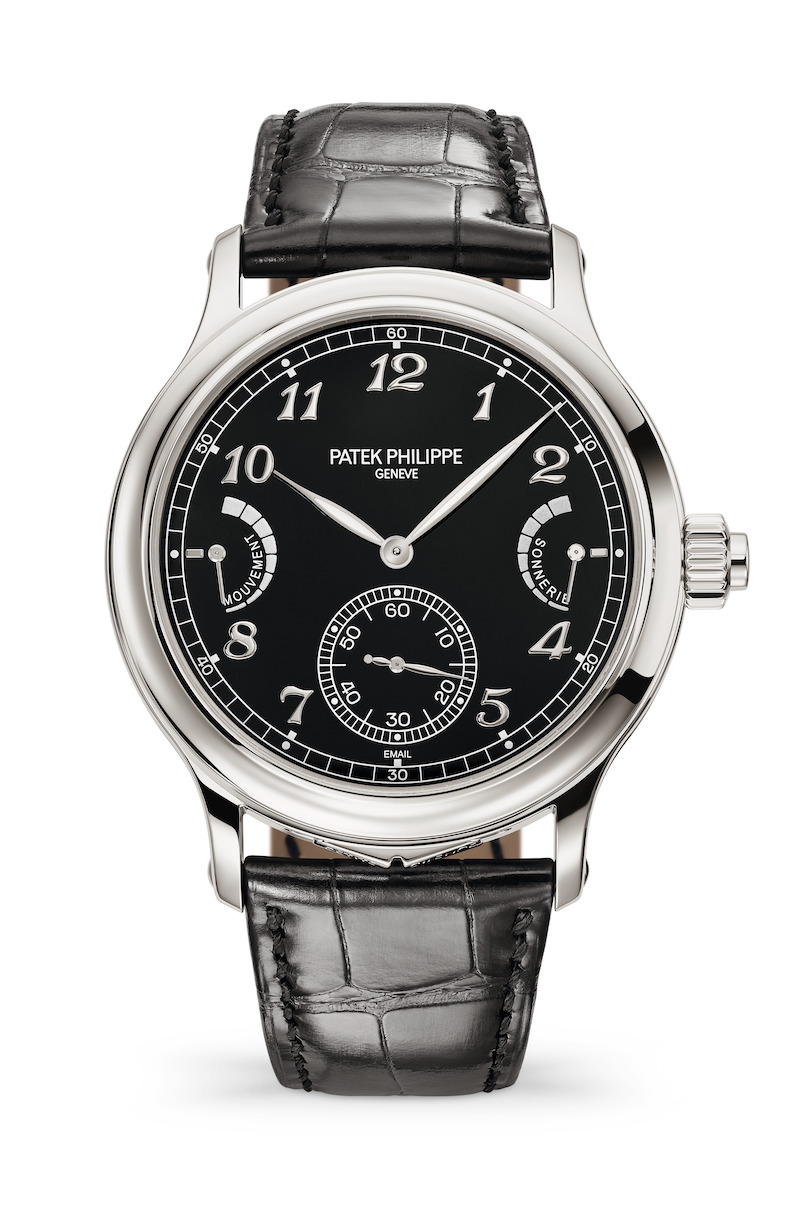 Perfection often looks simple, but it rarely is. This is also the case with the new Patek Philippe Ref. 6301P Grande Sonnerie. The watch is generously sized, measuring 44.8 mm in diameter, yet rather restraint in its design. Close observation will learn that it is rich in detail, as the platinum case has a subtle concave bezel and stunning countersunk flanks. The black dial is also a thing of beauty, as it is made from Grand Feu enamel, fitted with gold Breguet numerals. Interesting is that the traditional gold leaf-shaped hands feature a luminescent coating. It is a subtle detail, but it gives this classic watch a slight contemporary edge while making it more practical as well.