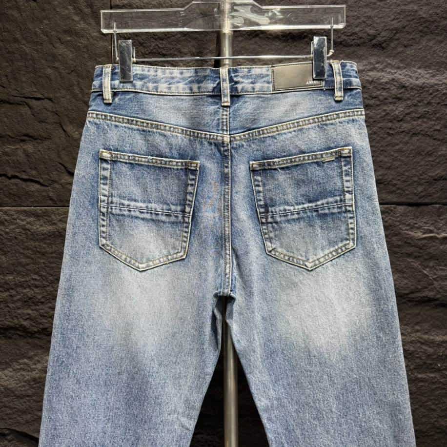 Amiri Denim Trousers Blue Jeans replicas provide an accessible way to enjoy the iconic style of Amiri’s high-end fashion. These replicas mimic the brand’s signature distressed designs, slim fit, and unique details. Offering a fashionable option for those who admire the original pieces but seek a more budget-friendly alternative.