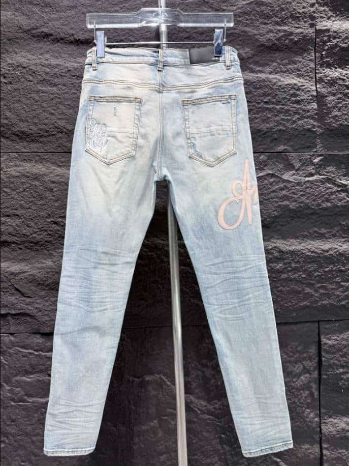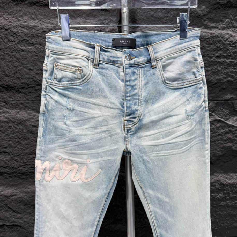 The Amiri Men Blue Script Logo Jeans replica brings the iconic style of the original design to an affordable option for fashion enthusiasts. These jeans feature a sleek blue denim base adorned with the signature Amiri script logo. Adding a bold, high-end streetwear vibe.