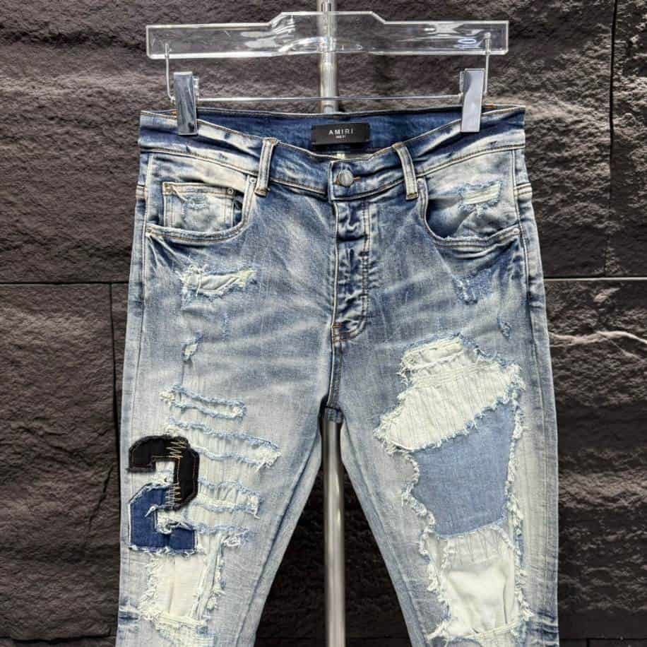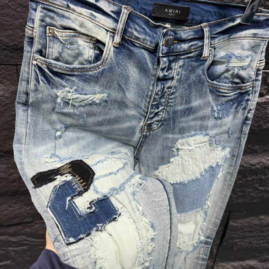 The Amiri Men Varsity Ripped Blue Jeans replica captures the edgy, high-fashion essence of the original design, offering a stylish yet accessible alternative. These jeans feature distressed detailing, including strategically placed rips and patches, that exude a casual yet rebellious vibe.