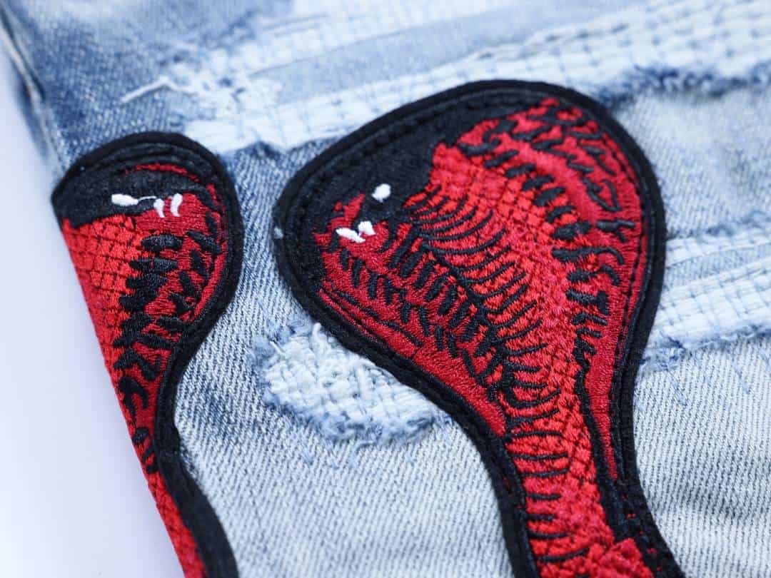Amiri Red Snake Archival Rip Jeans replicas bring the bold and distinctive design of the original into a more accessible price range. Featuring intricate red snake patterns, carefully crafted rips. And a striking mix of edgy and luxurious aesthetics, these jeans stand out as a statement piece.