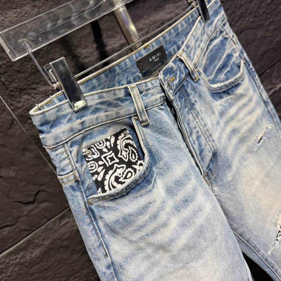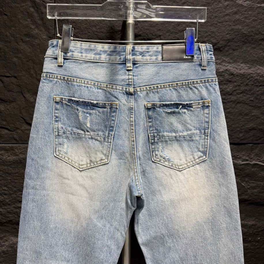 The Amiri Rip White Blue Jeans replica combines a fresh, modern aesthetic with the edgy flair of designer-inspired fashion. Featuring a crisp white and soft blue color scheme, these jeans stand out with their signature distressed details and carefully crafted rips that mimic the original Amiri design.