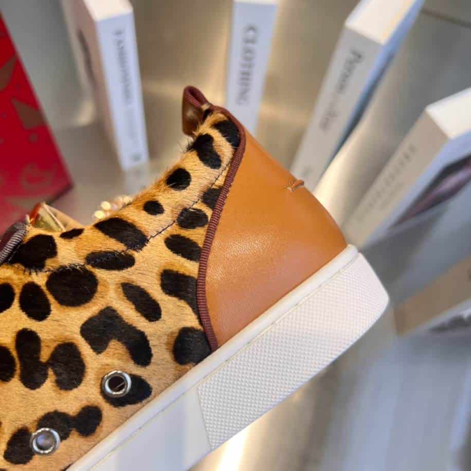 - The contrasting red sole and signature Louboutin embellishments create a dynamic look, perfectly suited for those with a daring fashion sense. Designed for both comfort and style, the Bottom Rivet Leopard Sneaker is a statement piece that brings a wild, sophisticated flair to any outfit. Making it a favorite for trendsetters seeking unique luxury footwear.