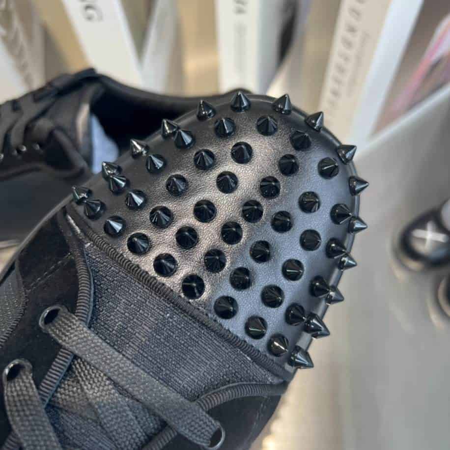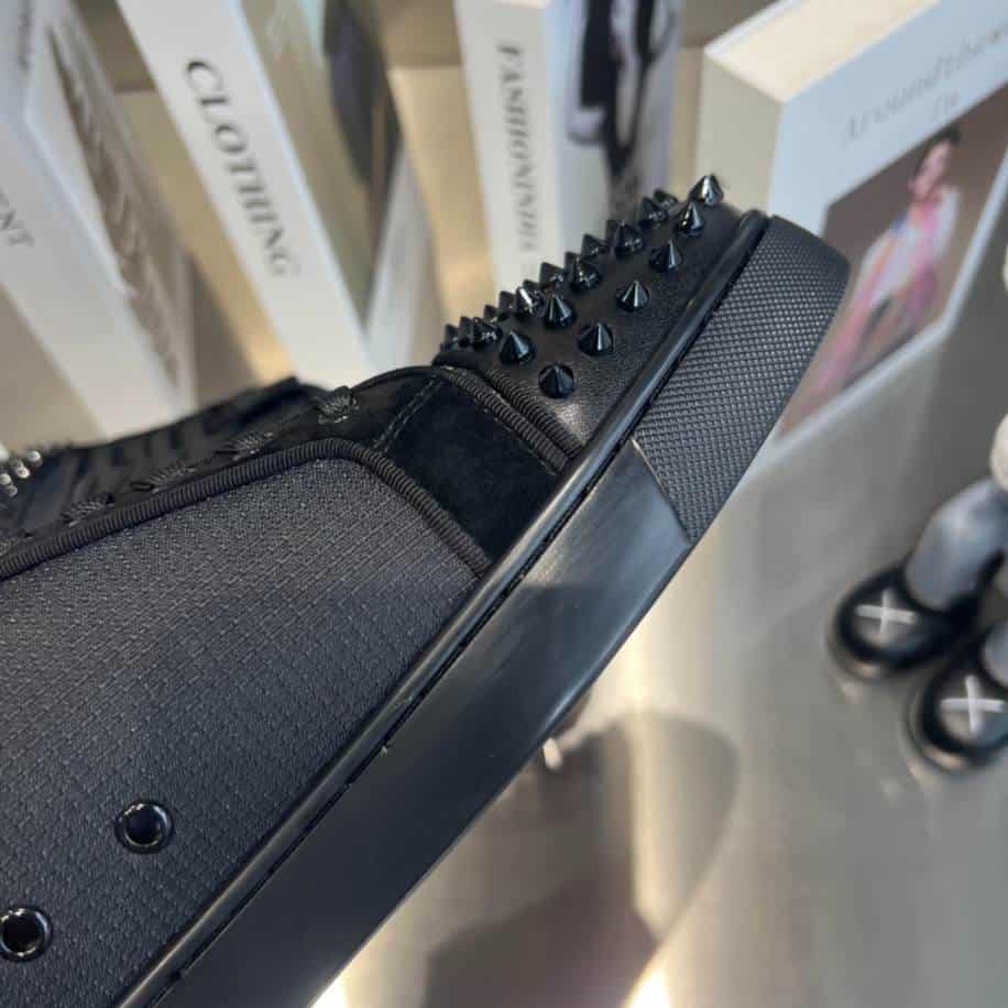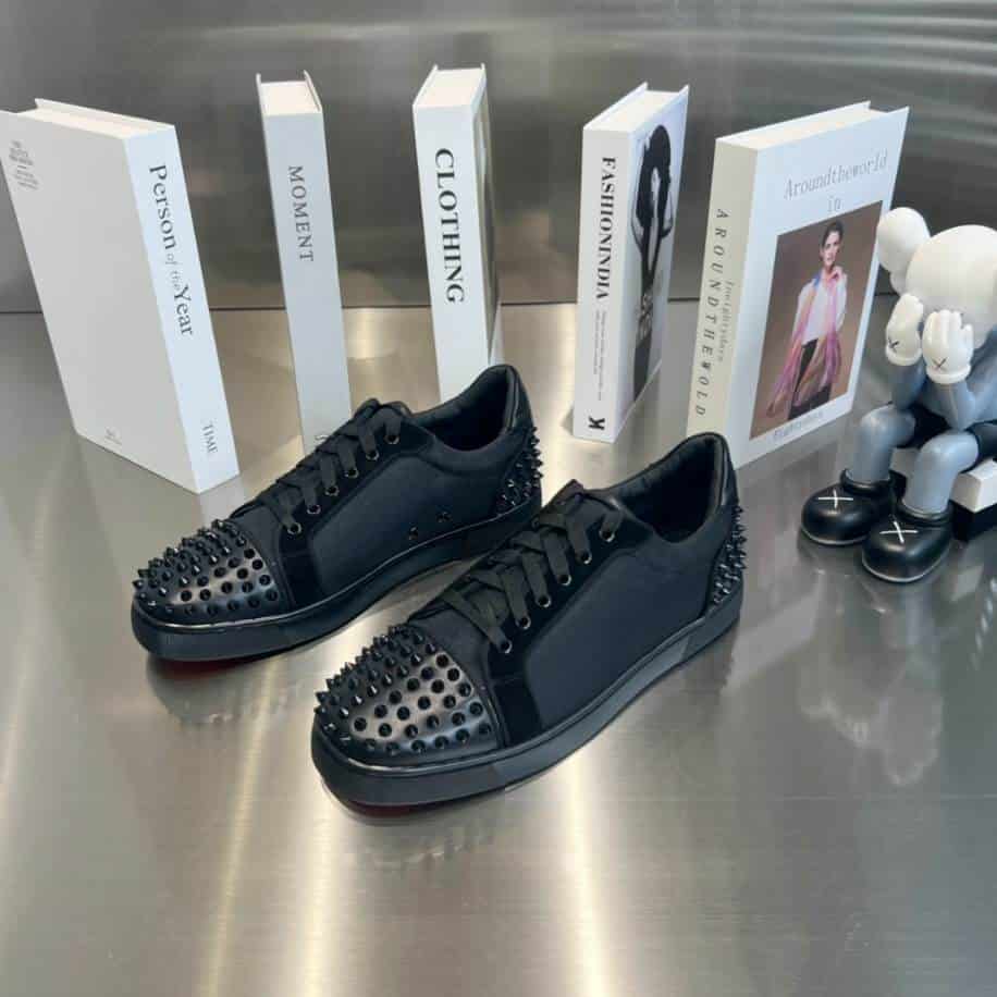 - The Christian Louboutin Casual Rivet Low Top Spikes Flats Black Sneaker is a bold, edgy shoe that combines luxury with urban flair. Designed in a sleek black finish. The sneaker is adorned with signature metallic spikes on the toe and upper, creating a striking visual contrast against the classic red sole.