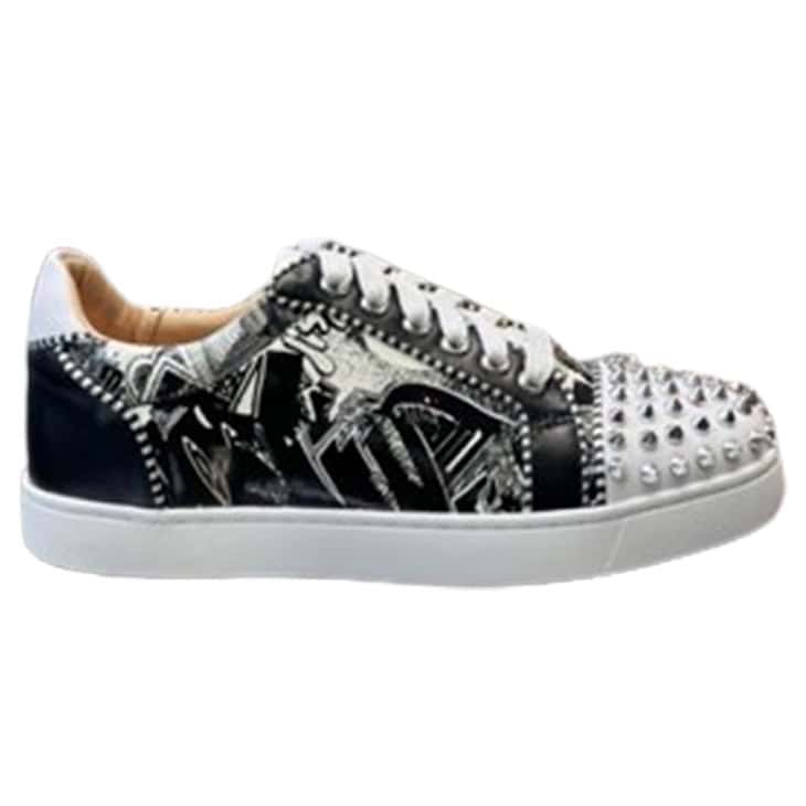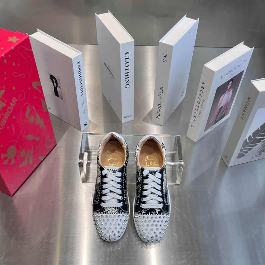 - The Christian Louboutin Casual Rivet Low Top Spikes Flats Sneaker is a bold and stylish footwear choice that combines luxury with an edgy streetwear vibe. Crafted with premium materials. These sneakers feature the brand’s signature red soles and are adorned with metallic spikes across the front, giving them a distinctive, rebellious flair.