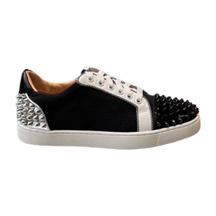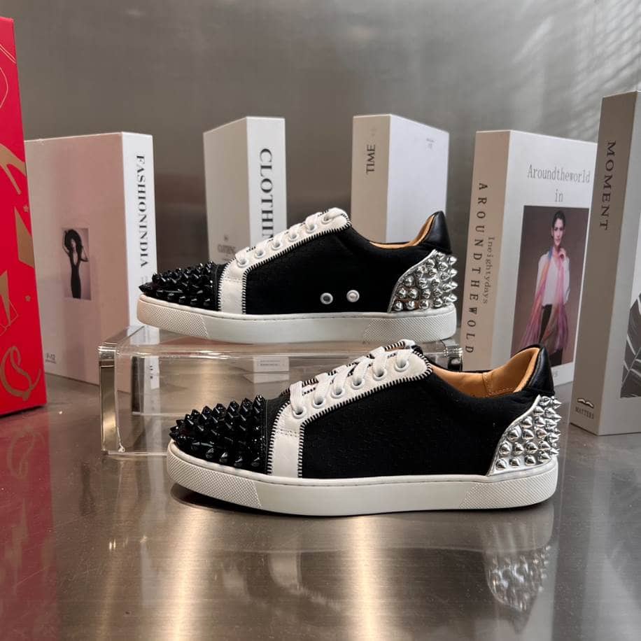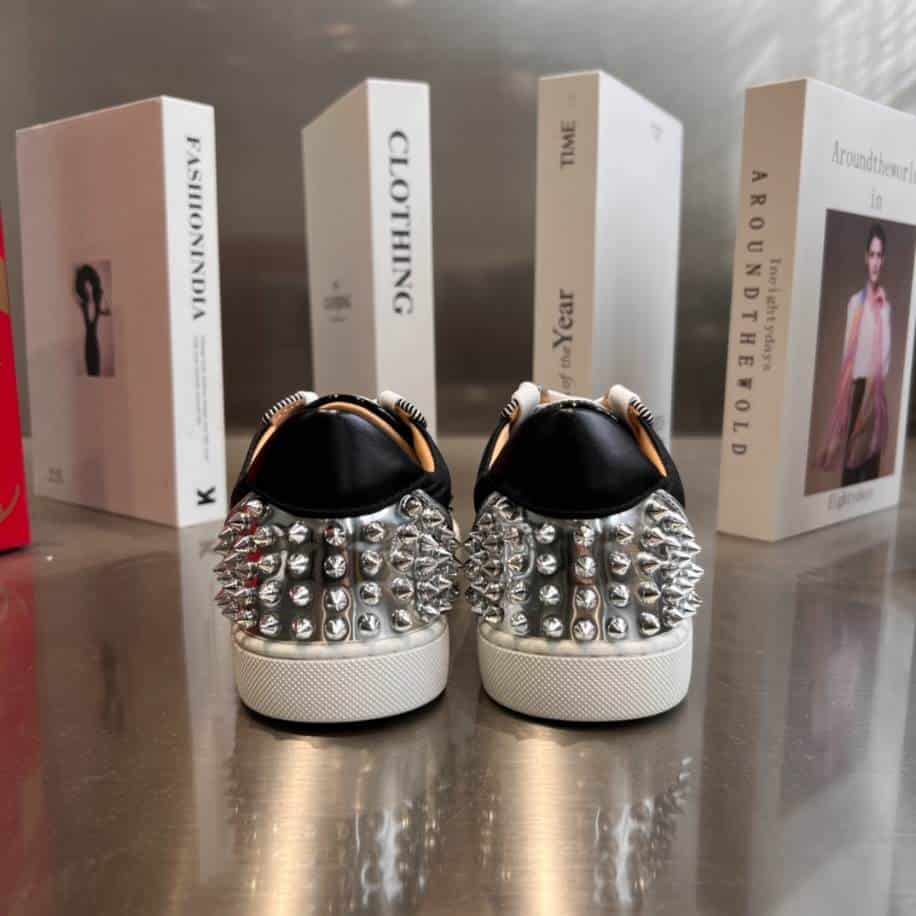 - The Christian Louboutin Low Top Black White Silver Sneaker is a stylish and sophisticated shoe that blends luxury with a sporty edge. Known for its sleek design, this sneaker features a striking combination of black, white, and silver hues, with subtle, eye-catching metallic accents that add a touch of elegance.