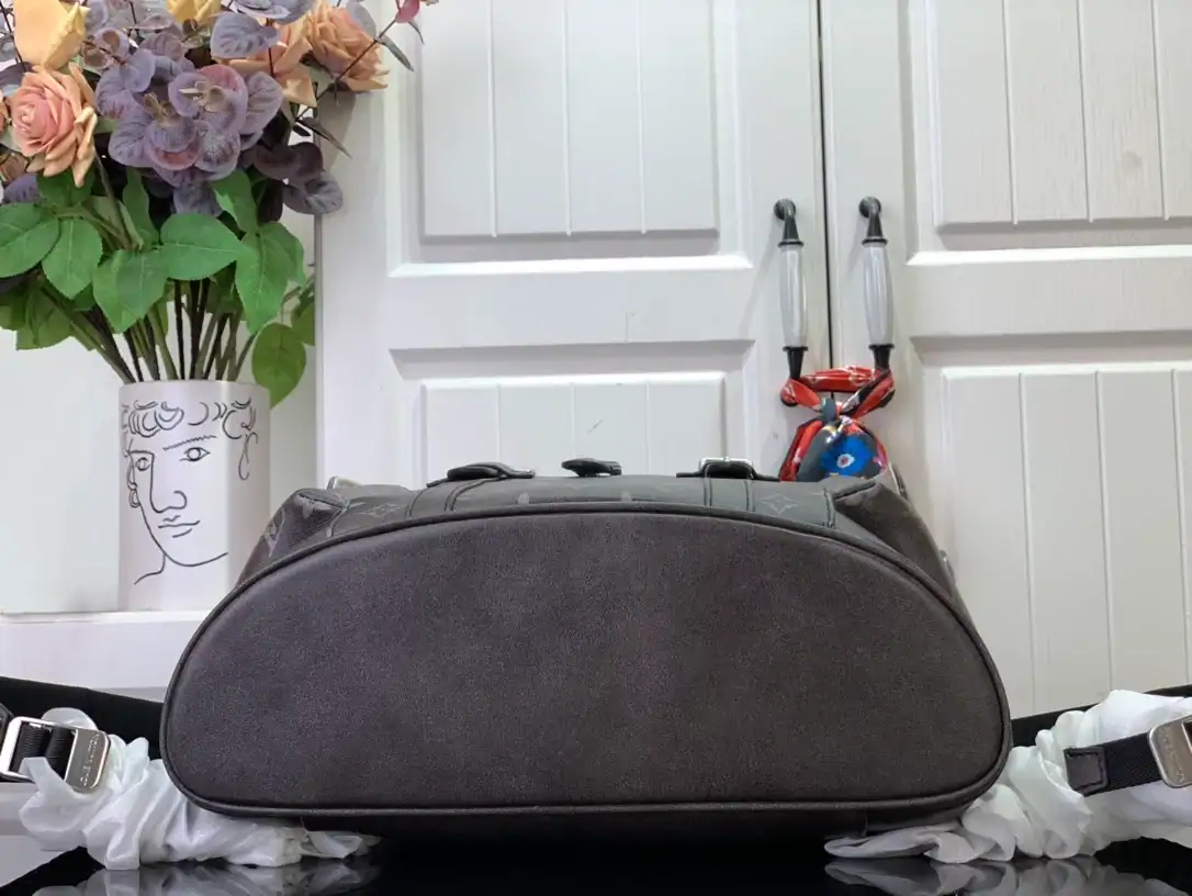 - The Christopher MM Backpack Black Brushed Monogram Cowhide Leather is a sleek and sophisticated bag designed for modern versatility. Crafted from luxurious brushed cowhide leather with a subtle monogram pattern, it exudes elegance and durability. Featuring a spacious main compartment, adjustable shoulder straps, and secure buckle closures, this backpack seamlessly blends functionality with contemporary style. Perfect for both business and casual use.