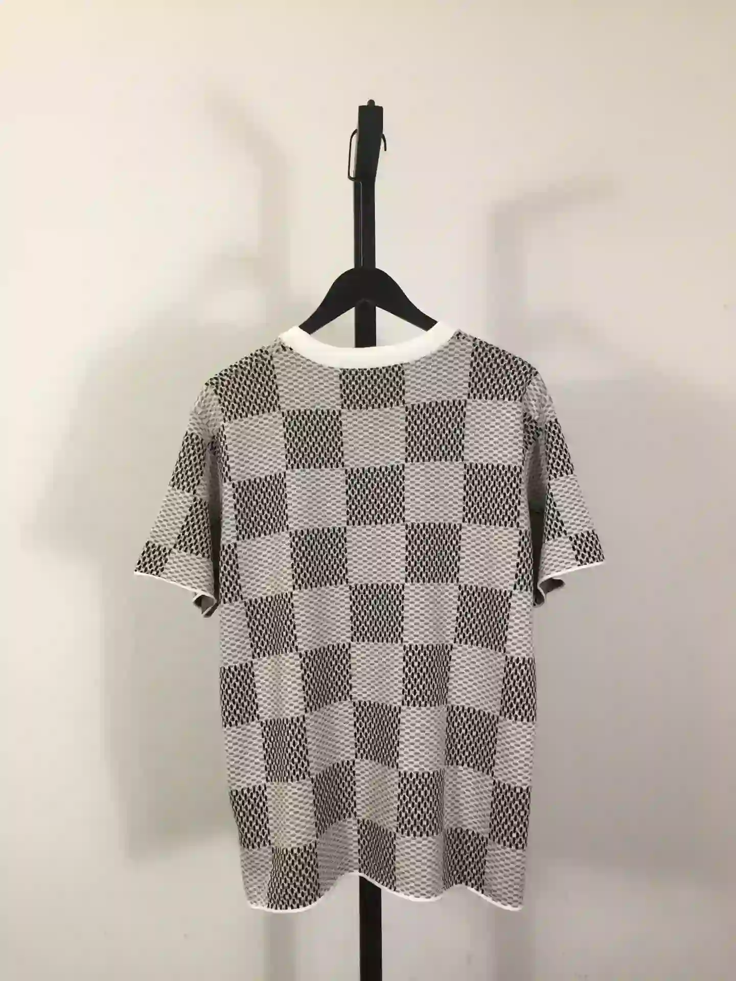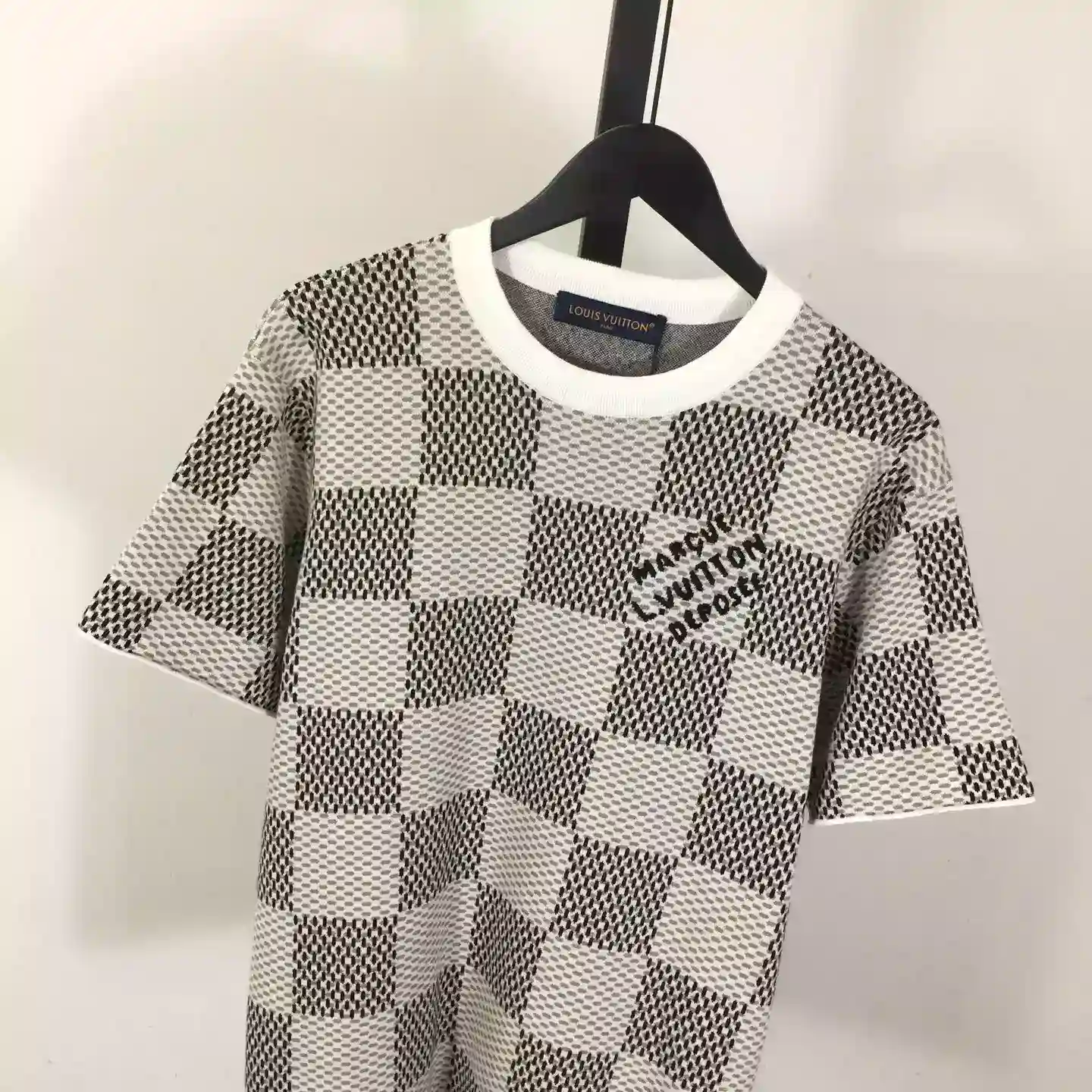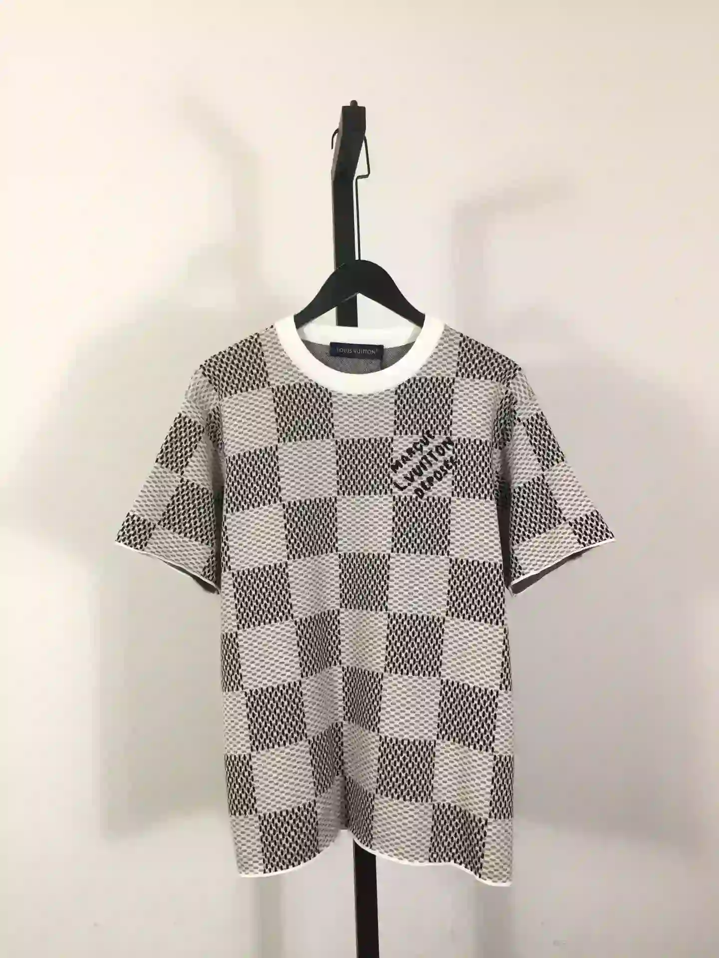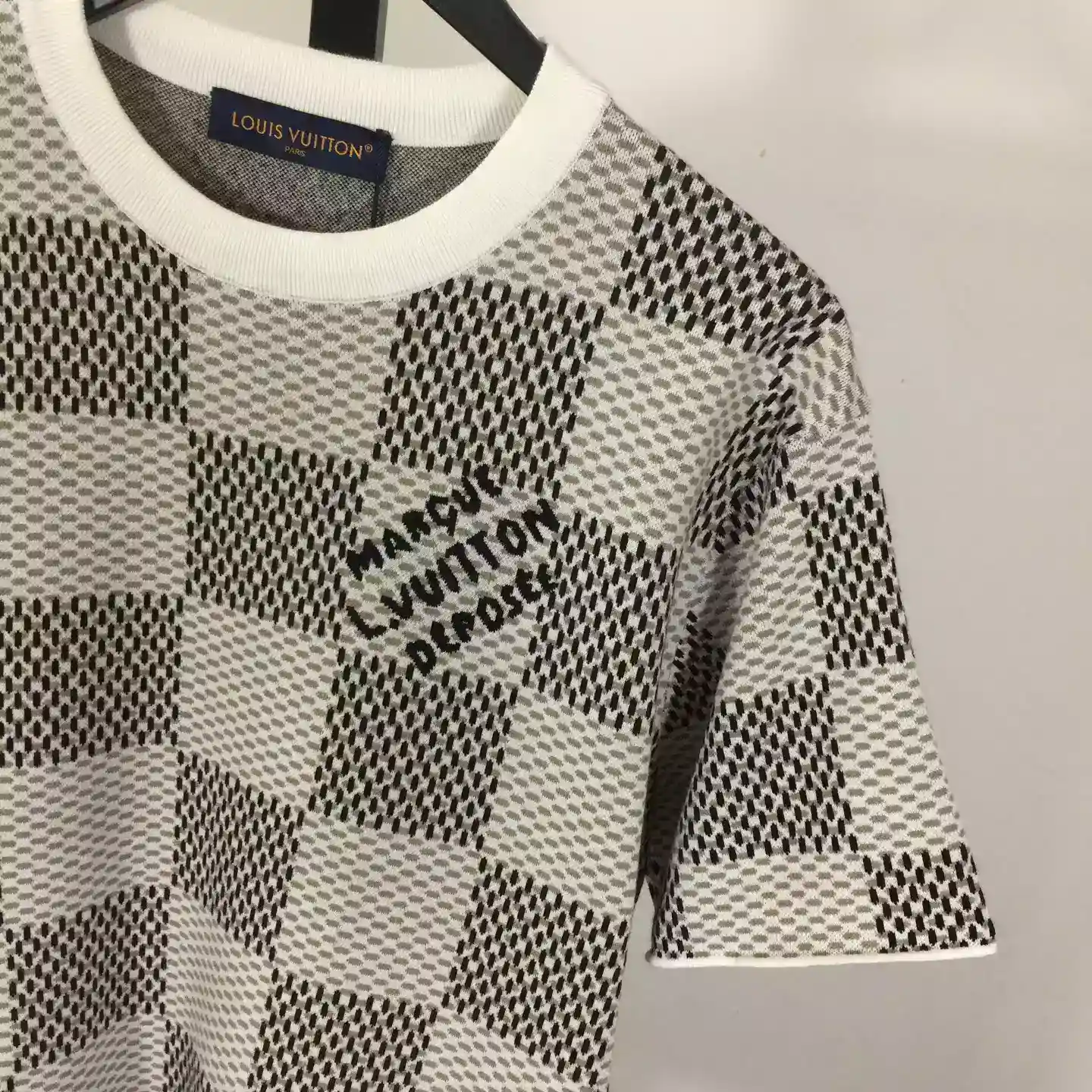 Discover the perfect blend of elegance and contemporary street style with the Damier Jacquard Short-Sleeved Crewneck ; LVTS089 from Louis Vuitton. Crafted in a premium jacquard weave, this timeless piece features the iconic Damier pattern subtly integrated into a soft, breathable fabric, offering both luxury and comfort.