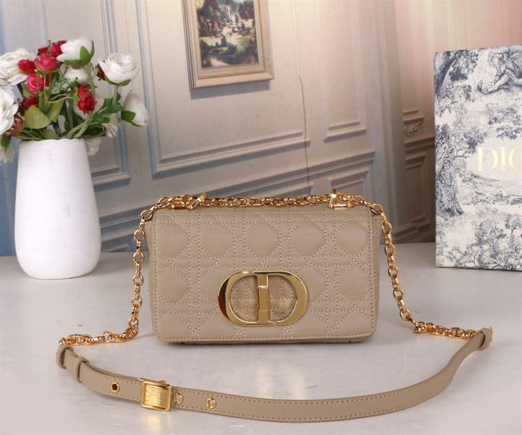 The Dior Small Dior Caro Bag in Beige Supple Cannage Calfskin is a refined and elegant accessory that epitomizes Dior’s dedication to luxury and timeless design. The ‘CD’ twist clasp adds a sophisticated touch, while the adjustable chain strap allows for versatile styling, whether worn over the shoulder or crossbody.