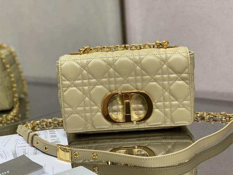 The Dior Small Dior Caro Bag in Gold Stone Supple Cannage Calfskin is a luxurious and glamorous accessory that exemplifies Dior’s timeless elegance. The ‘CD’ twist clasp in gold complements the rich hue, adding a touch of opulence. The adjustable chain strap offers versatility, allowing it to be worn on the shoulder or crossbody.