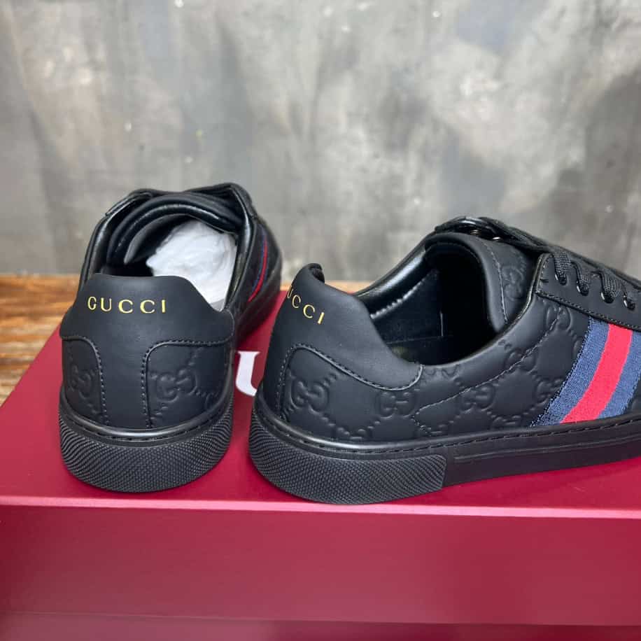 The Gucci Sneaker is a sleek and stylish twist on the brand’s classic Ace design. Featuring a striking black leather base adorned with Gucci’s iconic red-and-black web stripe along the sides. This low-top sneaker combines luxury with a bold color contrast, giving it an eye-catching appeal that effortlessly elevates both casual and upscale looks.