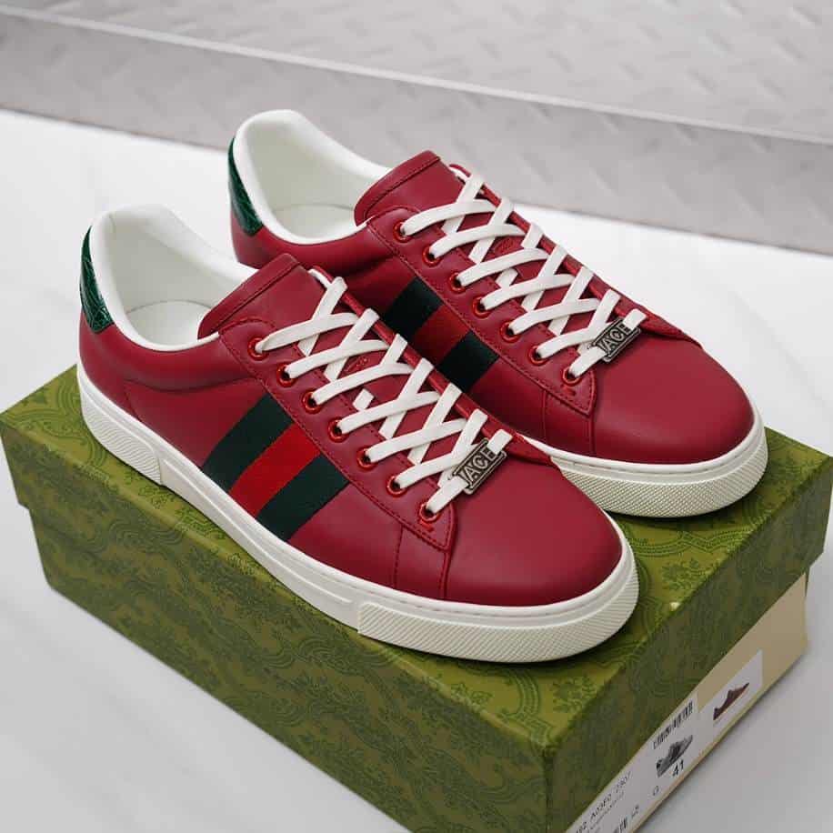 The Gucci Ace Rosso Ancora Red Nylon Sneakers replica captures the essence of the iconic luxury brand’s stylish design at a fraction of the price. Featuring a bold red nylon upper adorned with the signature Gucci stripes and intricate embroidery, these sneakers are a standout choice for fashion enthusiasts. While not authentic, this replica aims to replicate the original’s attention to detail and aesthetic appeal. Making it a popular option for those seeking a high-fashion look without the premium price tag. Perfect for casual wear, these sneakers blend comfort with trend-forward design.