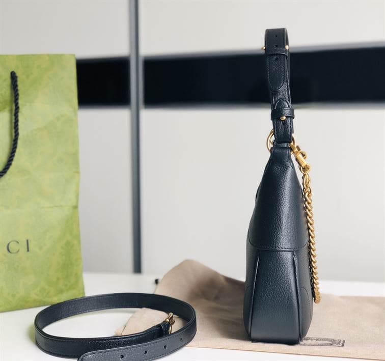 The Gucci Aphrodite Small Shoulder Bag in black leather is a perfect embodiment of understated elegance and contemporary sophistication. Its compact size is ideal for carrying essentials, making it a versatile choice for both day and evening wear. The adjustable shoulder strap offers comfort and convenience, while the bag’s refined design ensures it complements any outfit effortlessly. The Gucci Aphrodite Small Bag in black leather is a must-have accessory for those who appreciate classic style with a modern twist.