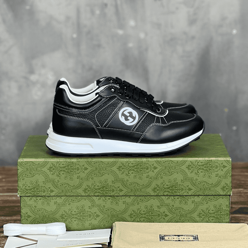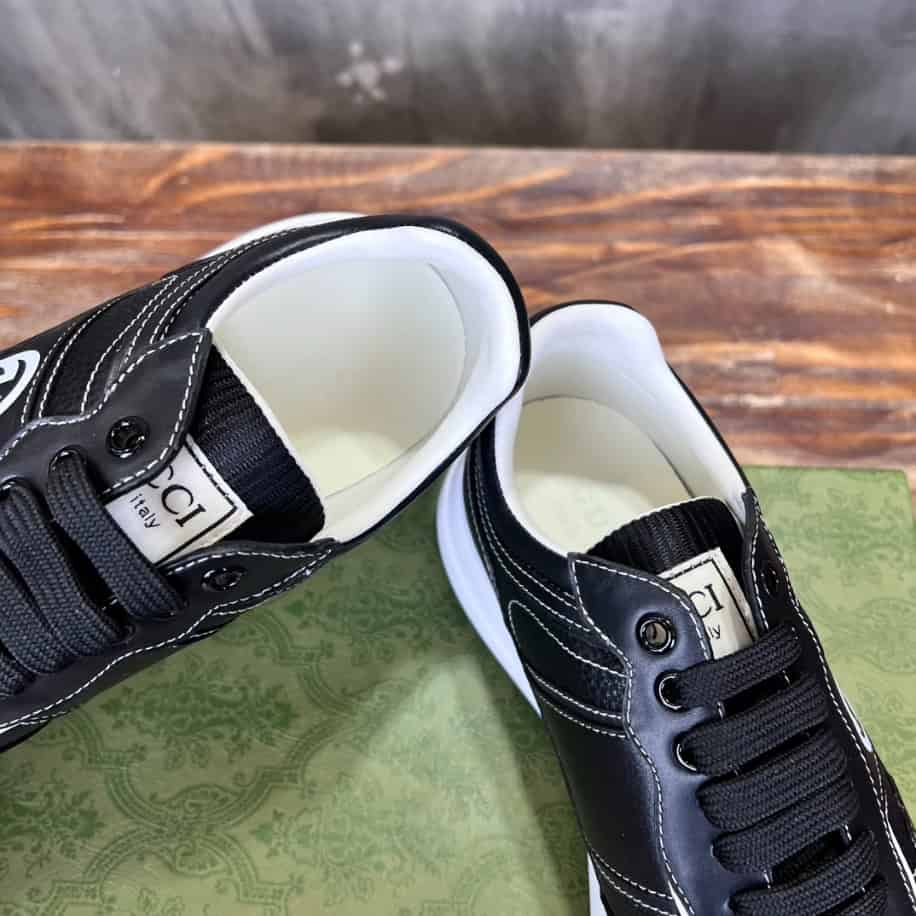 The Gucci Sneaker combines casual elegance with signature Gucci flair, offering a versatile yet bold look. This sneaker features a sleek black leather upper paired with a contrasting white sole, creating a striking monochrome effect that complements various outfits.