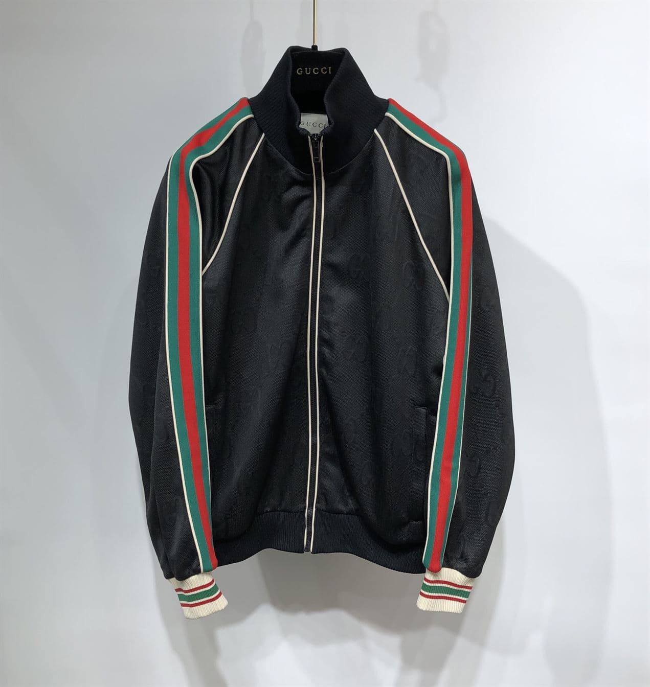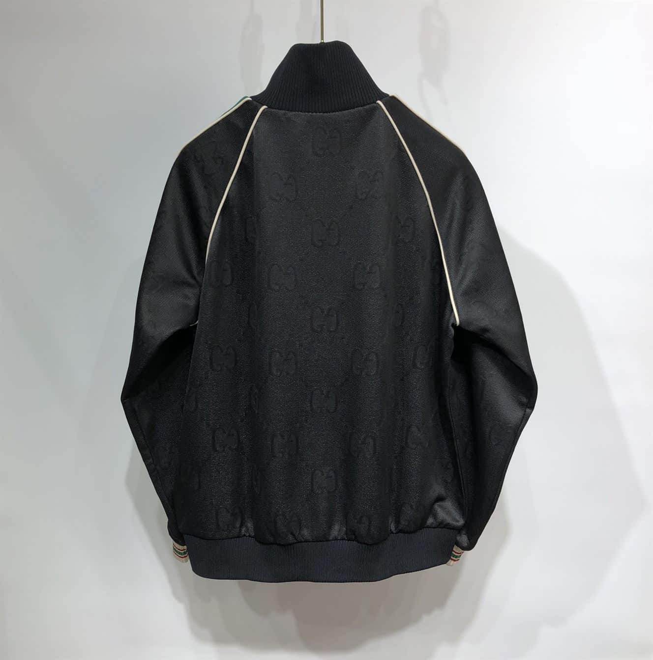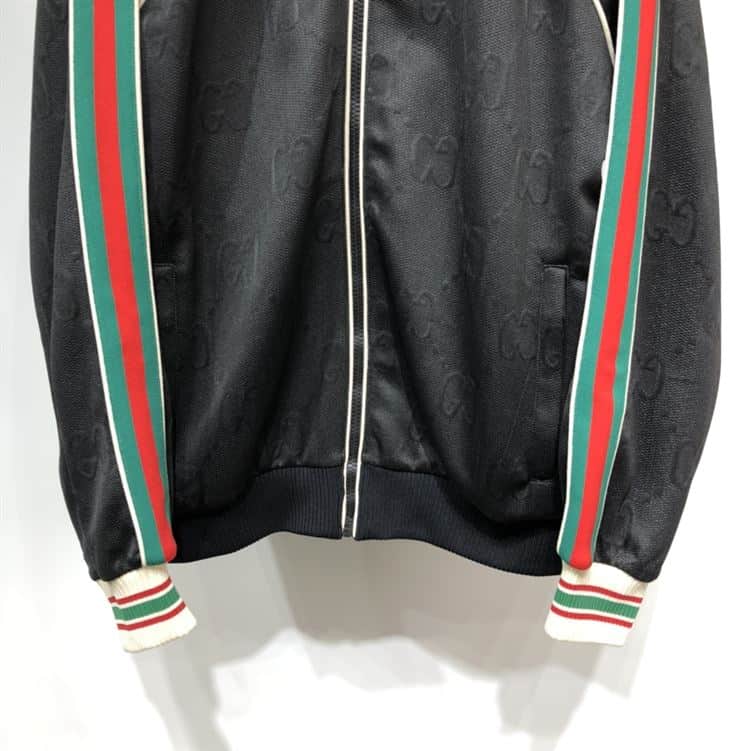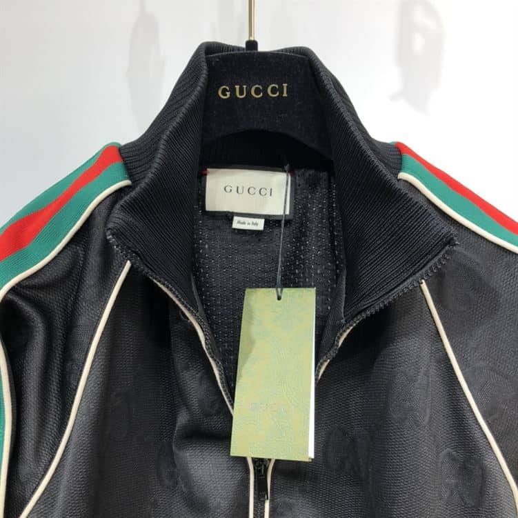 #GucciSignatureStyle#BlackZipJacket#GGJacquardFashion#LuxuryJerseyWear#DesignerStatementPiece