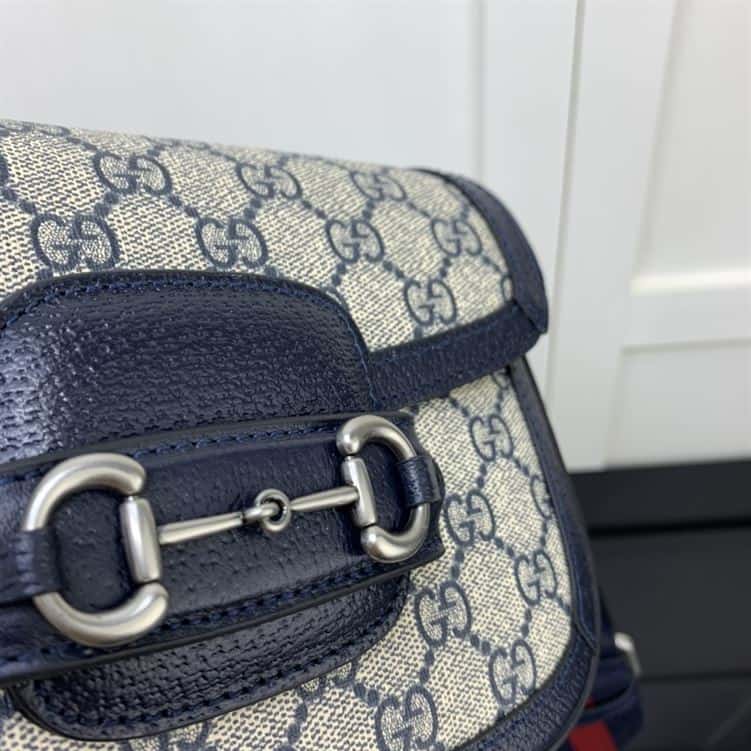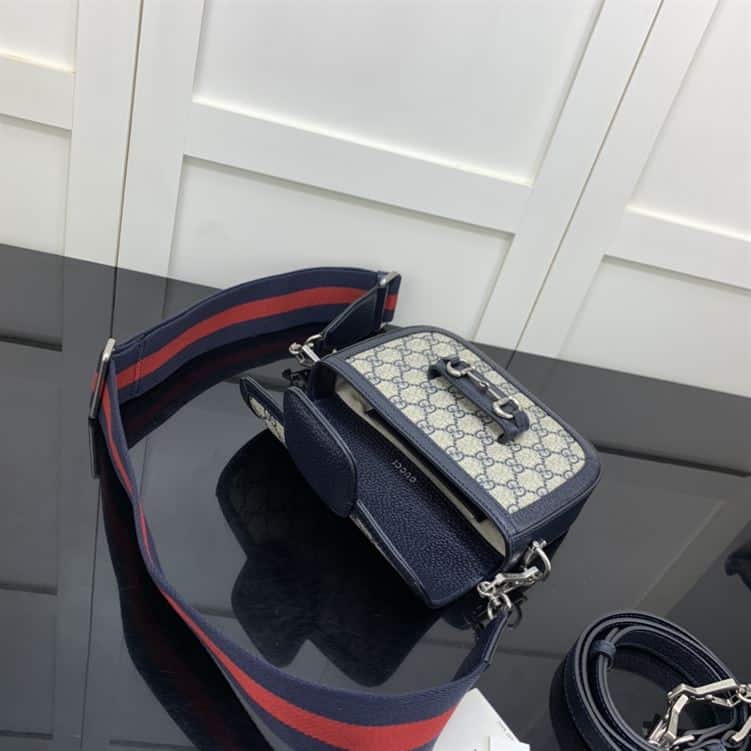 The Gucci Horsebit 1955 Mini Bag in Beige and Blue GG Supreme Canvas is a chic and timeless accessory that seamlessly blends heritage design with modern flair. Its compact size is perfect for carrying essentials. While the adjustable leather strap allows for versatile styling as a shoulder or crossbody bag. The Gucci Horsebit 1955 Mini Bag is a statement piece that adds a touch of elegance and luxury to any ensemble.