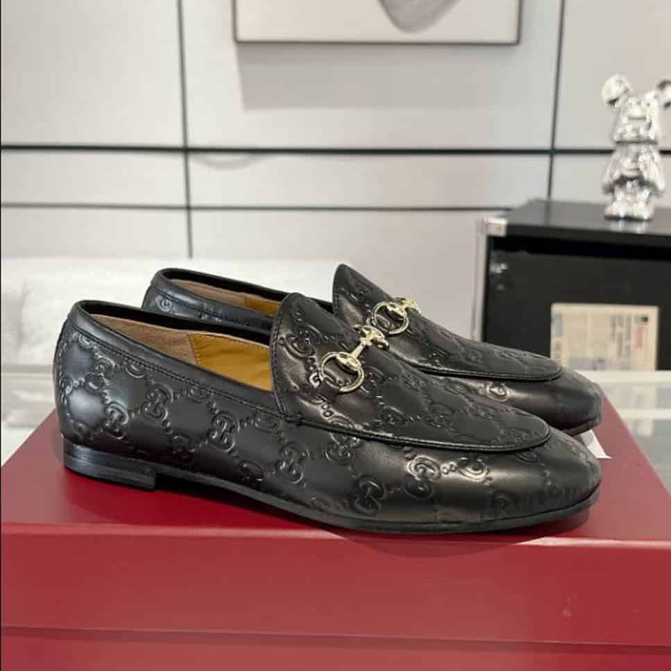The Gucci Horsebit Black GC Monogram Loafer replica recreates the bold sophistication of Gucci’s iconic design with its sleek black finish and signature GC monogram pattern. Adorned with the classic horsebit detail, this replica aims to deliver a high-fashion look at a more affordable price.