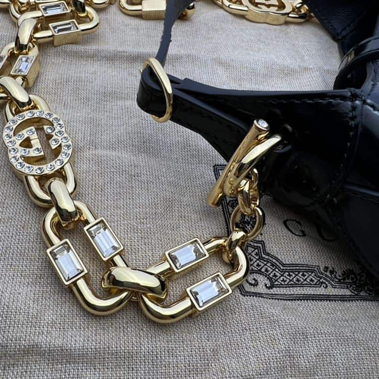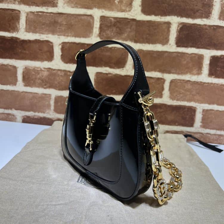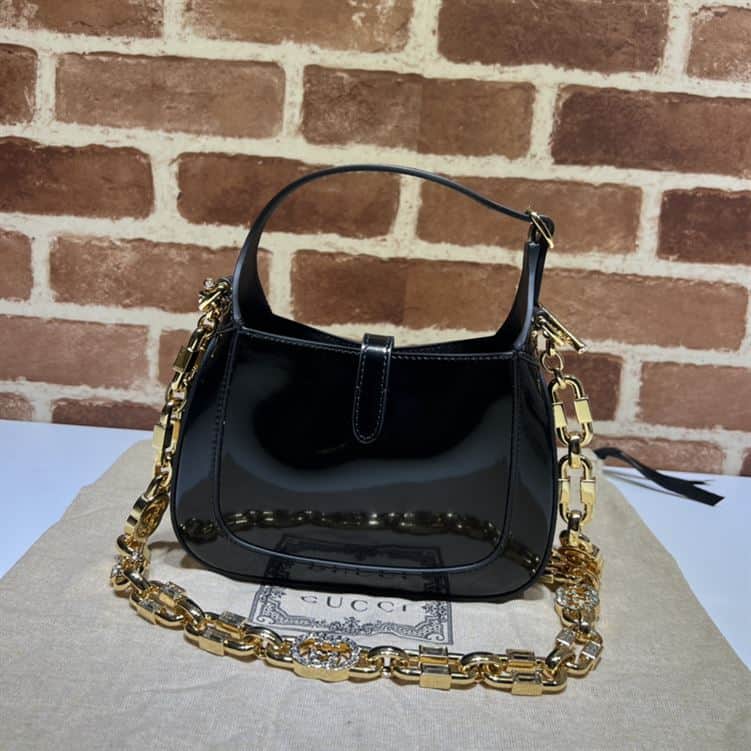 The Gucci Jackie 1961 Mini Shoulder Bag in Black Patent Leather is a timeless and sophisticated accessory that exudes understated elegance. Crafted from sleek black patent leather, this mini shoulder bag features the iconic piston closure and the signature curved silhouette that defines the Jackie 1961 collectsion. Its compact size and adjustable shoulder strap make it perfect for both day and evening wear, offering versatility and practicality.