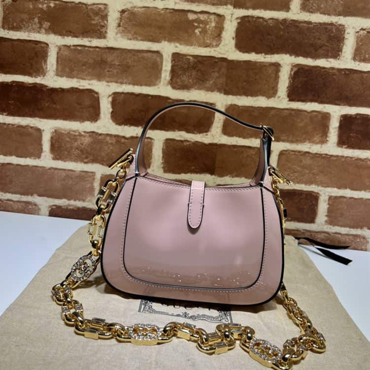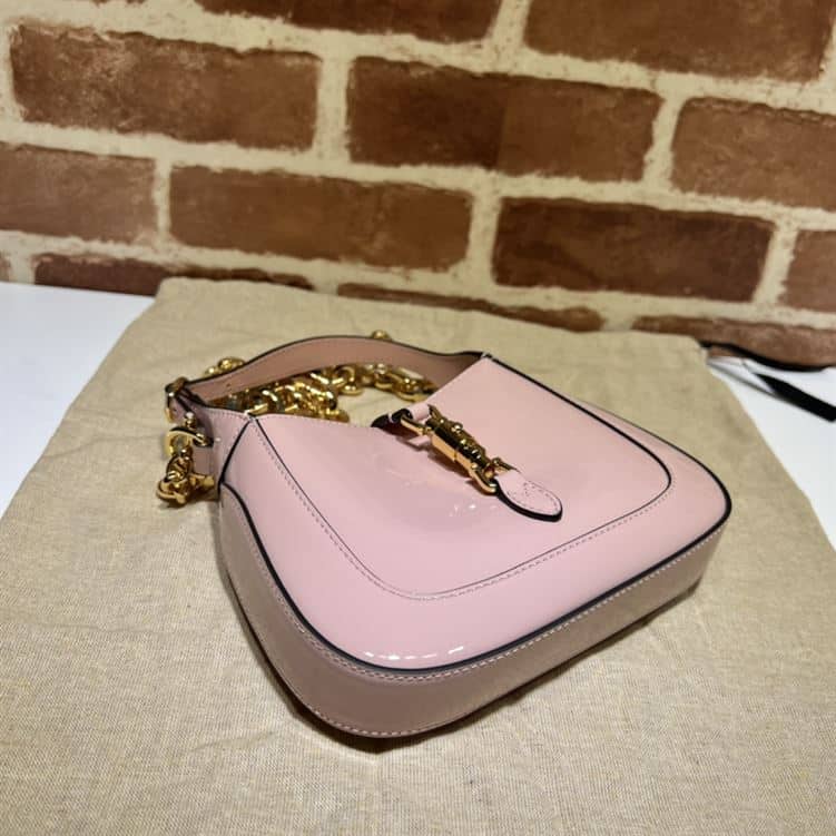 The Gucci Jackie 1961 Mini Shoulder Bag in Pink Patent Leather is a delightful blend of retro charm and contemporary luxury. Crafted from smooth pink patent leather, this mini shoulder bag features the iconic piston closure and the signature curved silhouette that defines the Jackie 1961 collectsion.