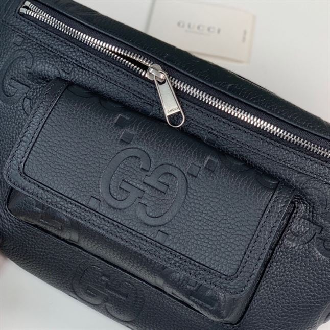 - The Gucci Jumbo GG Belt Bag in black is a bold and modern accessory that embodies Gucci’s innovative spirit and attention to detail. Featuring the oversized interlocking GG logo. Designed for versatility. It can be worn around the waist or across the body, offering hands-free convenience.